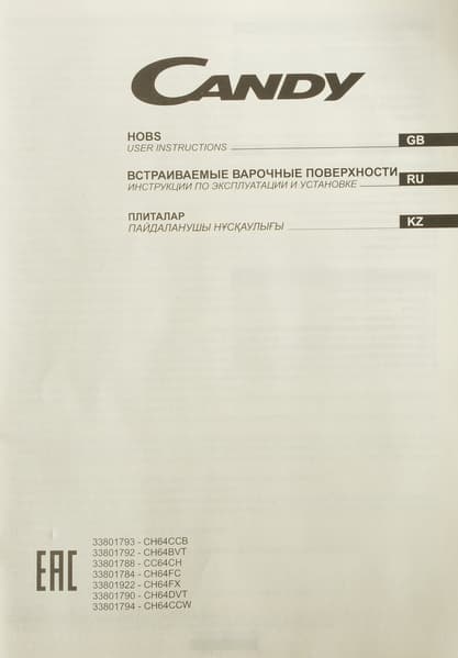 В комплект варочной панели входит руководство по эксплуатации формата А4, напечатанное на простой бумаге, напоминающей газетную. Документ составлен на трех языках: английском, русском и казахском.