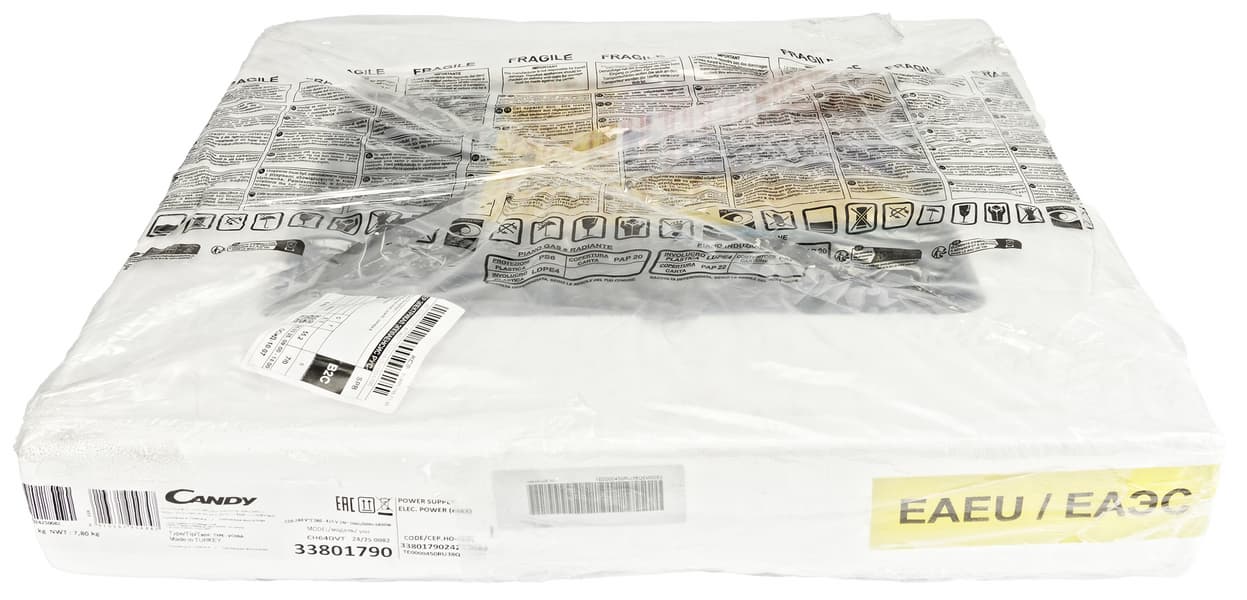 Candy CH64DVT помещена в пару пенопластовых ложементов, дополнительно обернутых прочным полиэтиленом с массой транспортировочных значков и предупреждений об аккуратном обращении с упаковкой. Сверху и на одной из боковых граней размещены наклейки со штрих-кодами, номером модели и технической информацией.