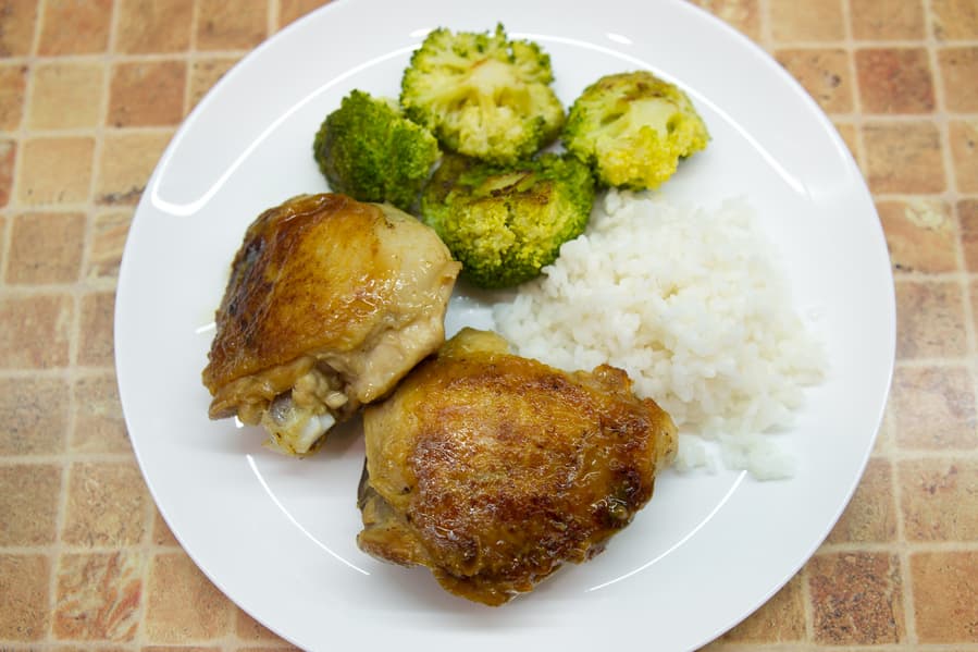 Рис, как и положено, сварился минут через 15 после закипания. На полноценное прожаривание куриных бедер ушло в общей сложности 35 минут.