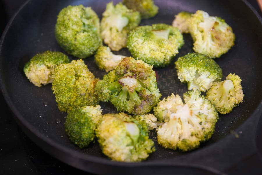 Брокколи не планировалось зажаривать сильно, и вот такой результат, полученный за пару минут на 6-м уровне нагрева, мы посчитали достаточным.