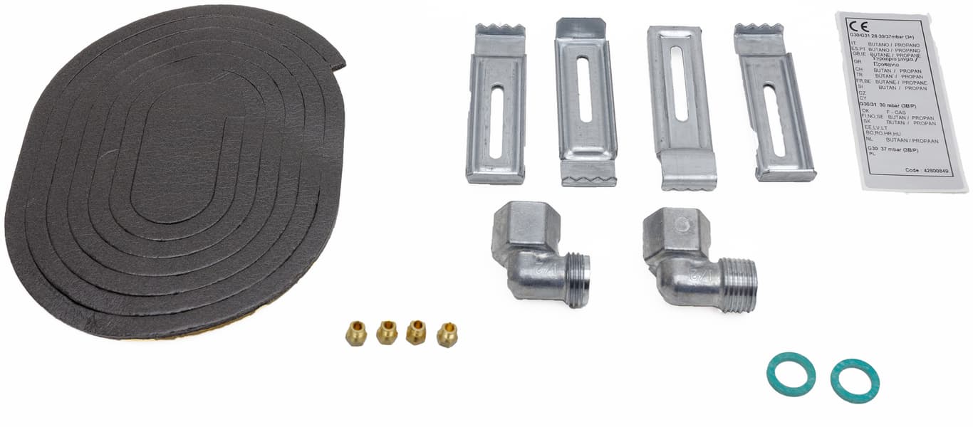 Для монтажа и подключения к газовой магистрали поверхности Candy CHG6BF4WPX в комплекте дано все необходимое — монтажные скобы-фиксаторы, шурупы, 2 уплотнительные газовые прокладки, 2 угловых штуцера (под цилиндрическую и коническую резьбу). Между столешницей и панелью прокладывается уплотнительная лента, которая тоже входит в комплект.