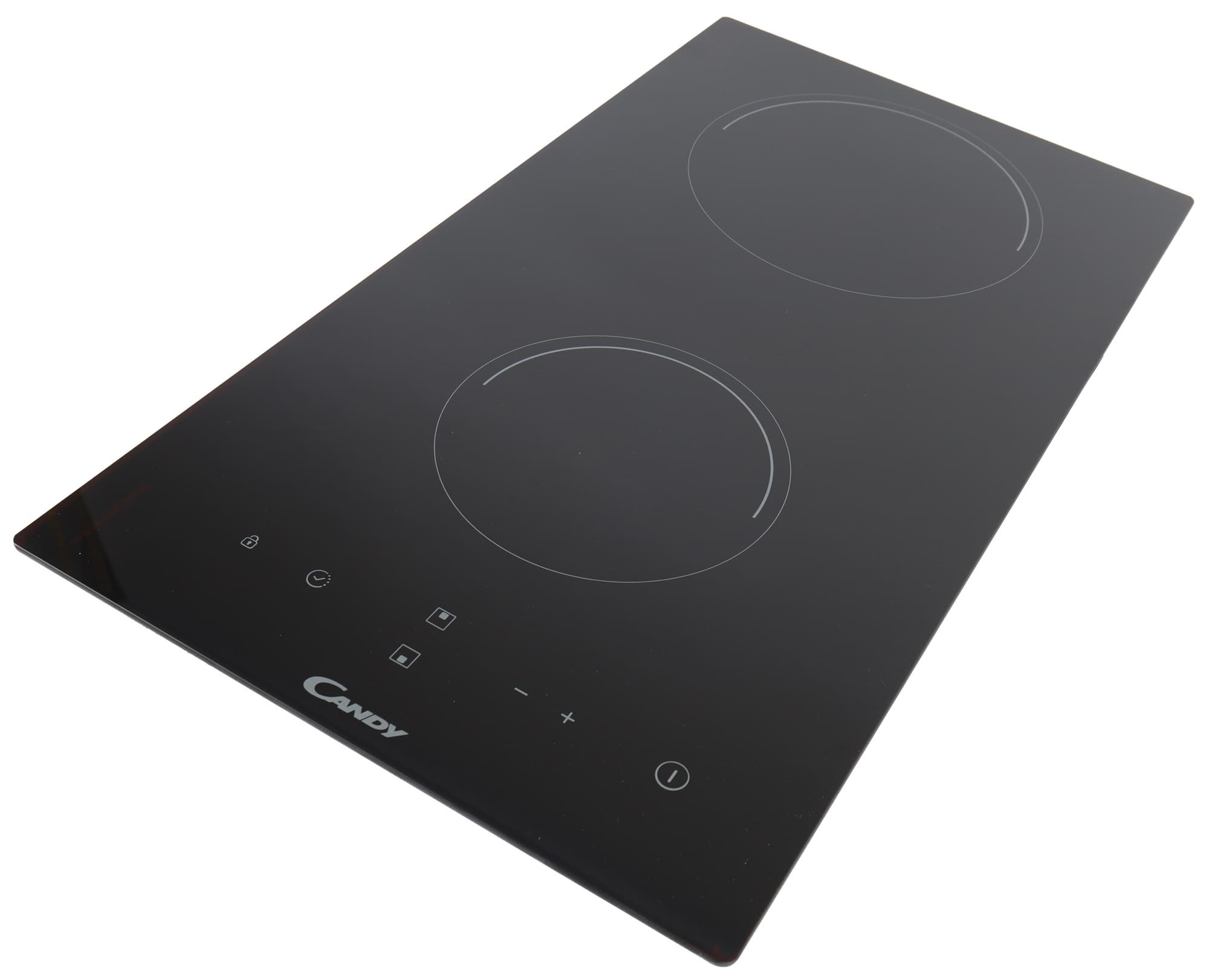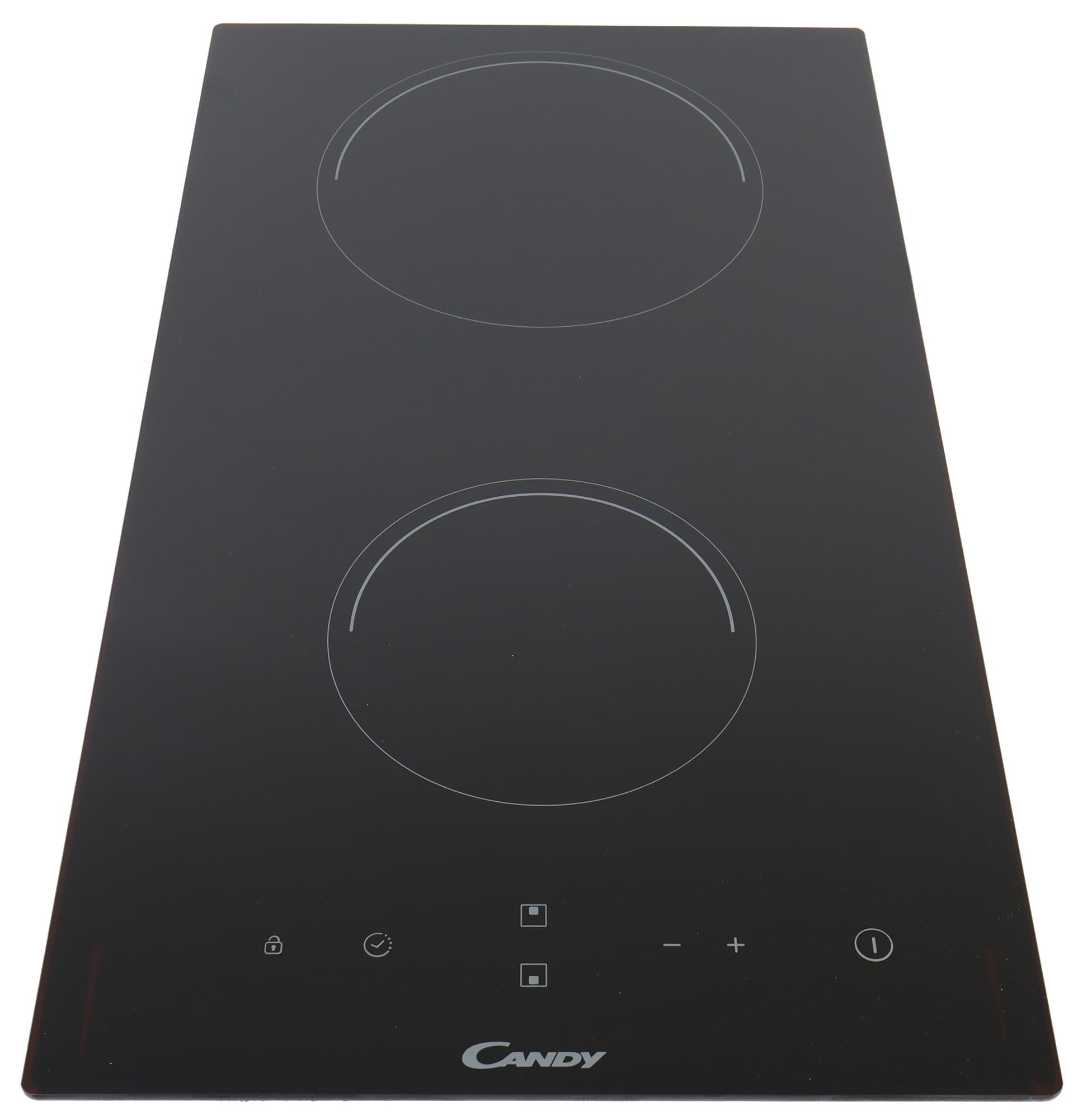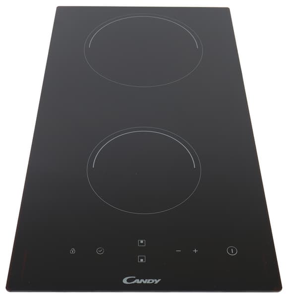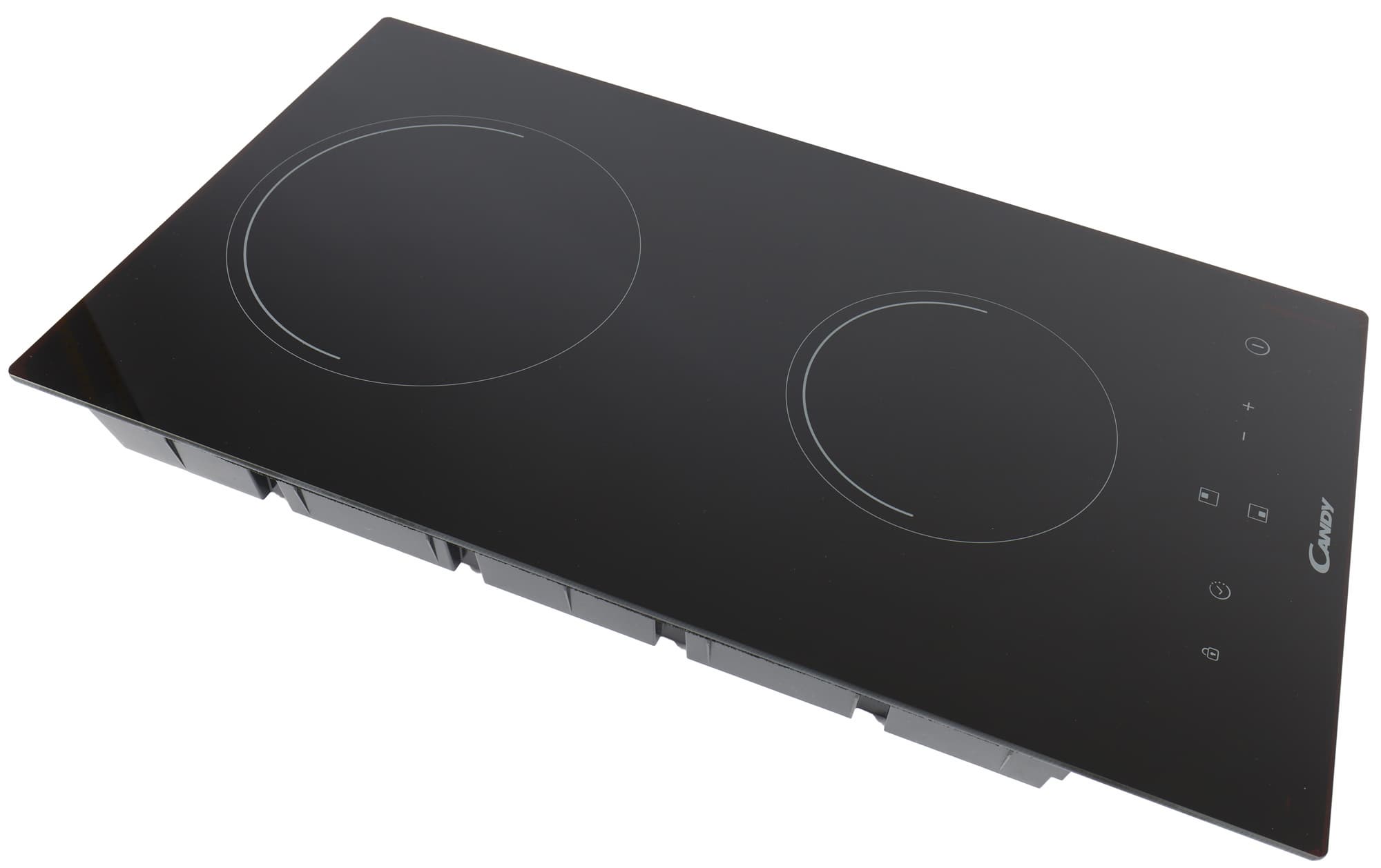 Candy CID 30/G3 — узкая безрамочная панель с двумя конфорками разного диаметра и сенсорным управлением. Встраиваемая модель независимого типа выполнена в черном цвете, контуры зон нагрева и сенсорные кнопки обозначены белым.