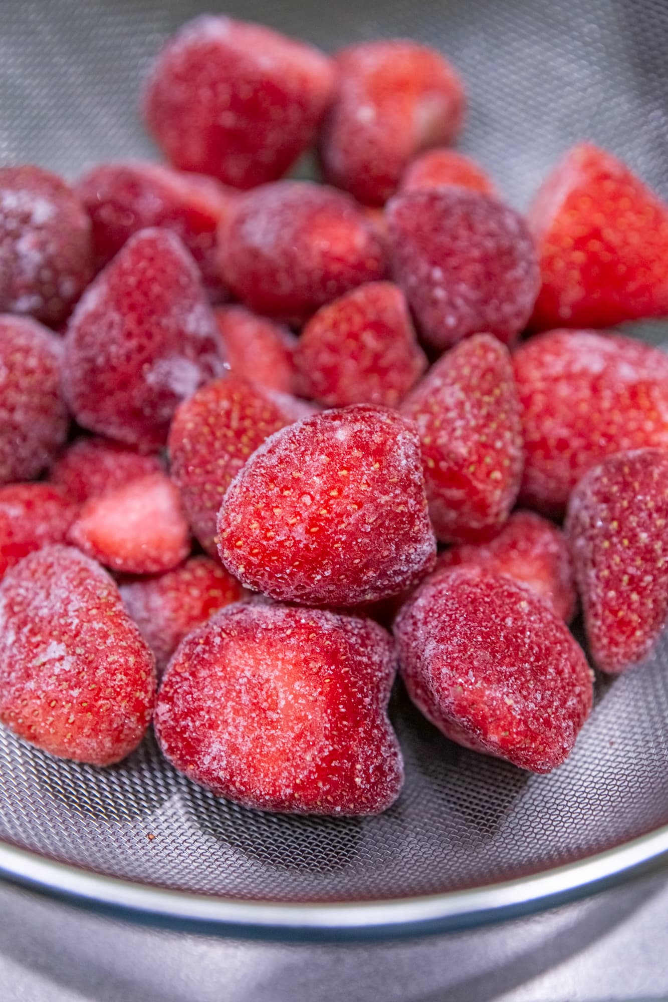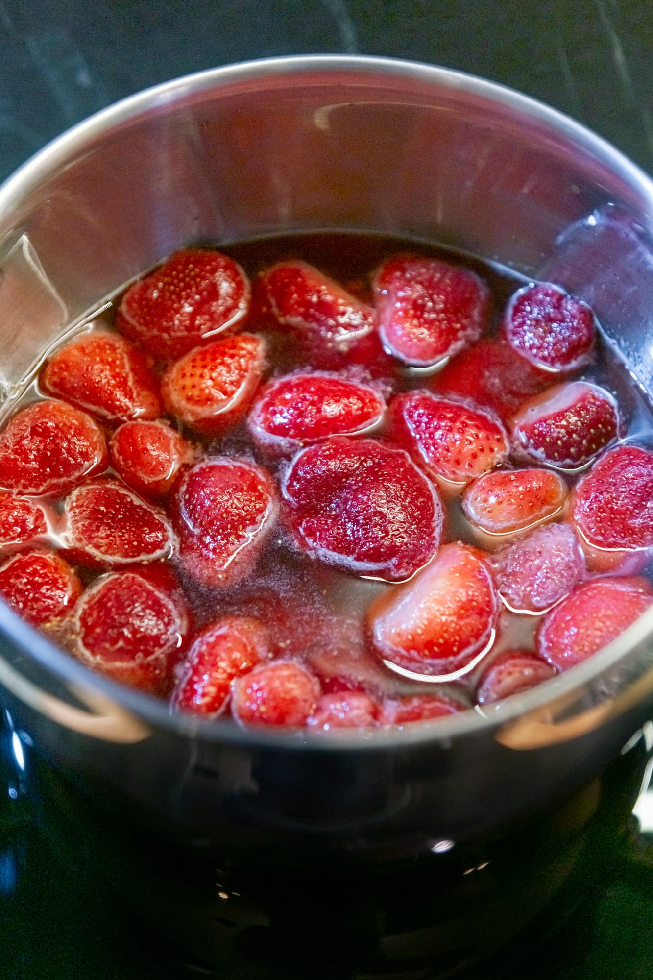 Для приготовления десерта мы поместили в кастрюлю 600 г замороженной клубники, 250 г сахара, пару щепоток лимонной кислоты и добавили 700 мл воды.