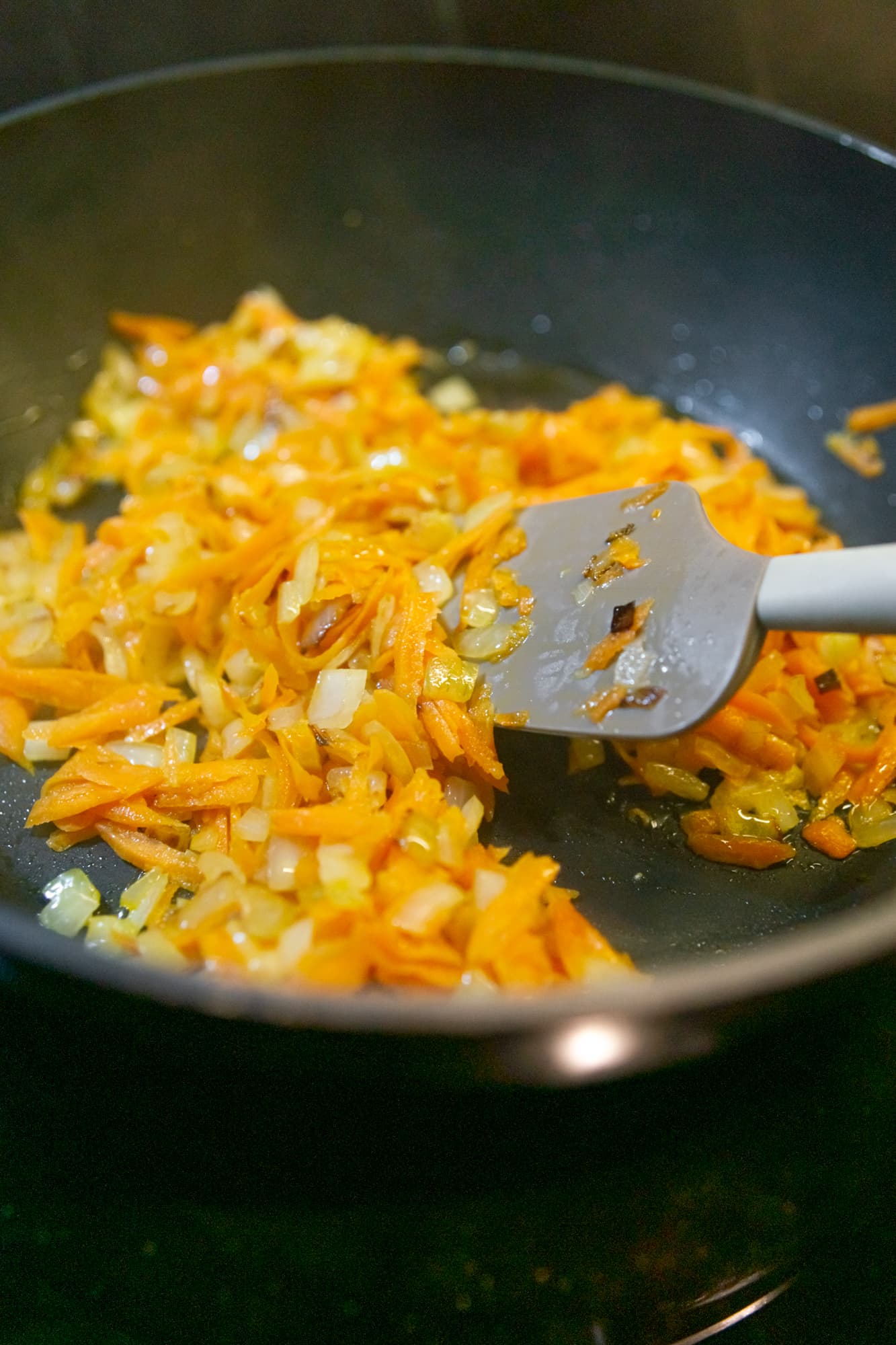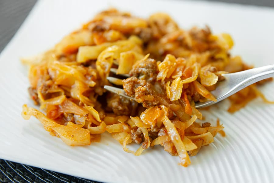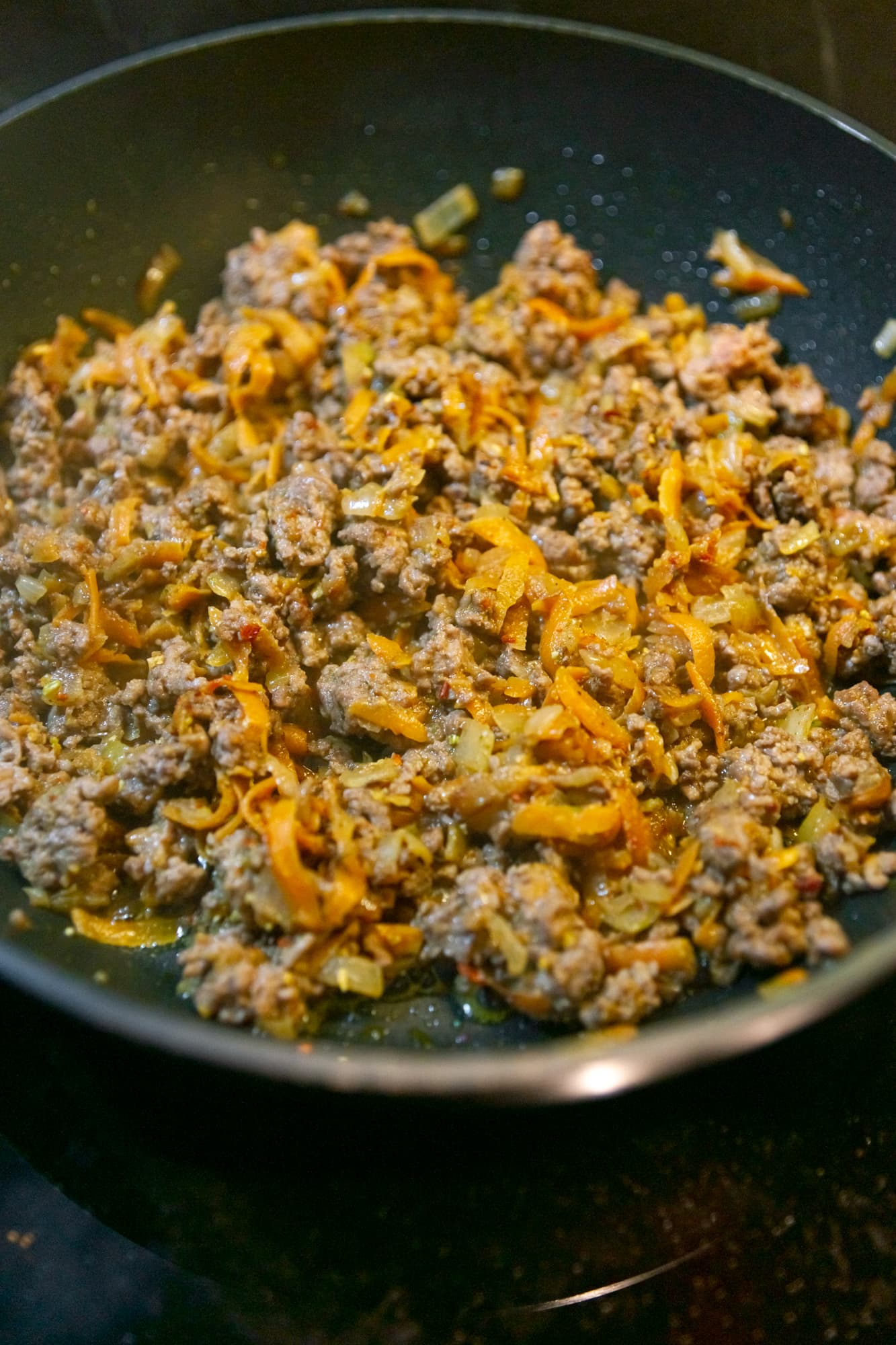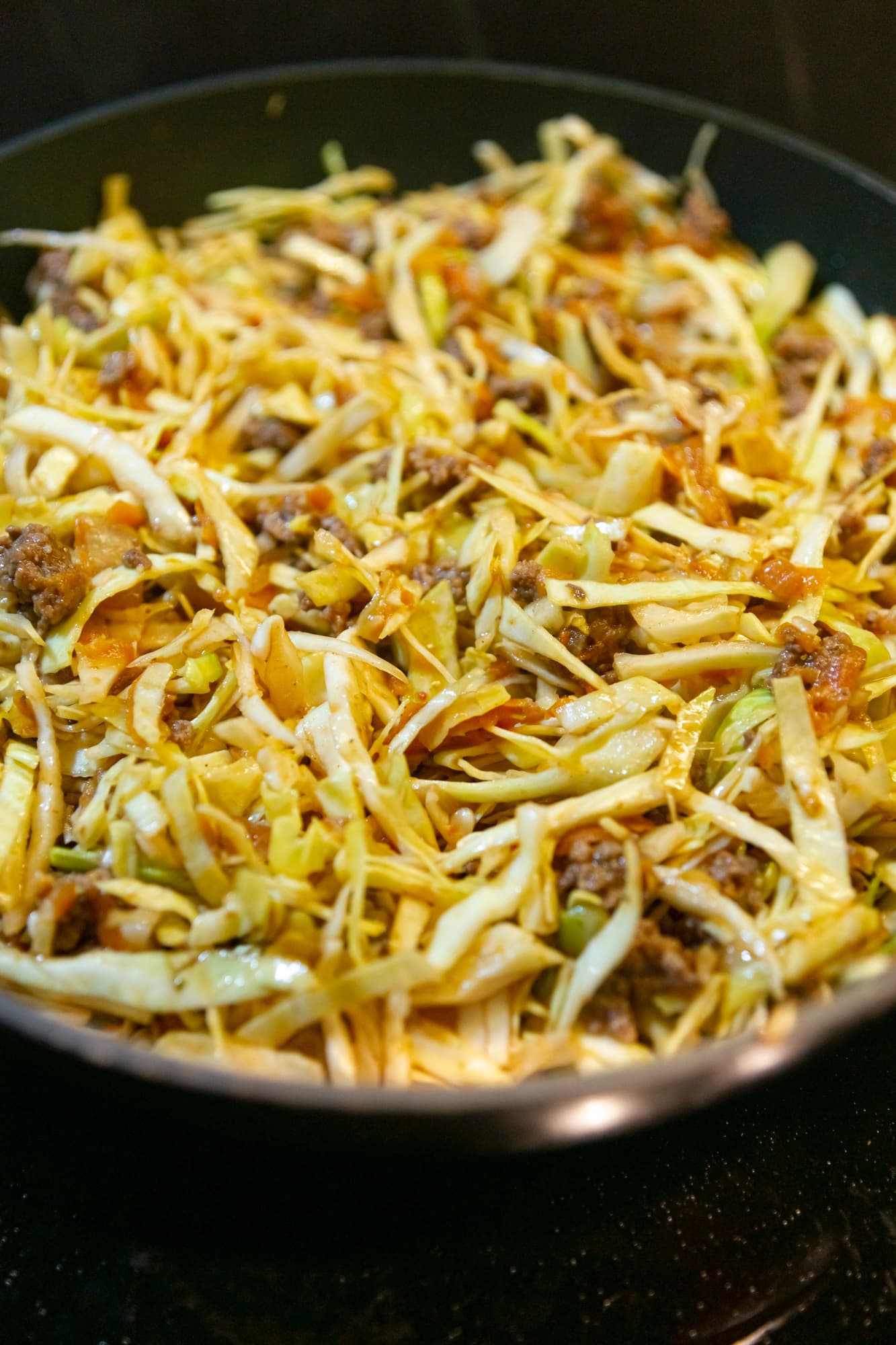 Для начала на 8-м уровне мощности обжарили лук и морковь, затем присоединили к ним говяжий фарш. Позже добавили разведенную в небольшом количестве воды томатную пасту с солью и специями и нашинкованную капусту. Хорошо перемешали, снизили мощность нагрева до 5 и накрыли крышкой. В процессе содержимое сковороды пару раз перемешивали.