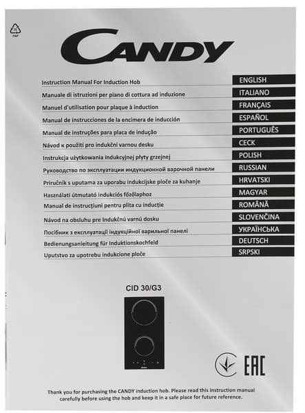 Руководство по эксплуатации Candy CID 30/G3 представлено в виде тяжелой объемной книжки формата А4 на 18 языках. Помимо нее, в комплект документов входит листок с дополнительной информацией, предназначенной только для рынка РФ.