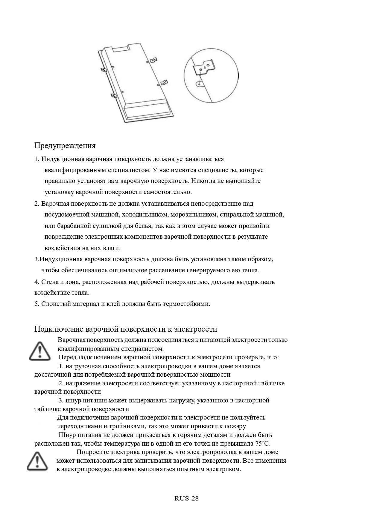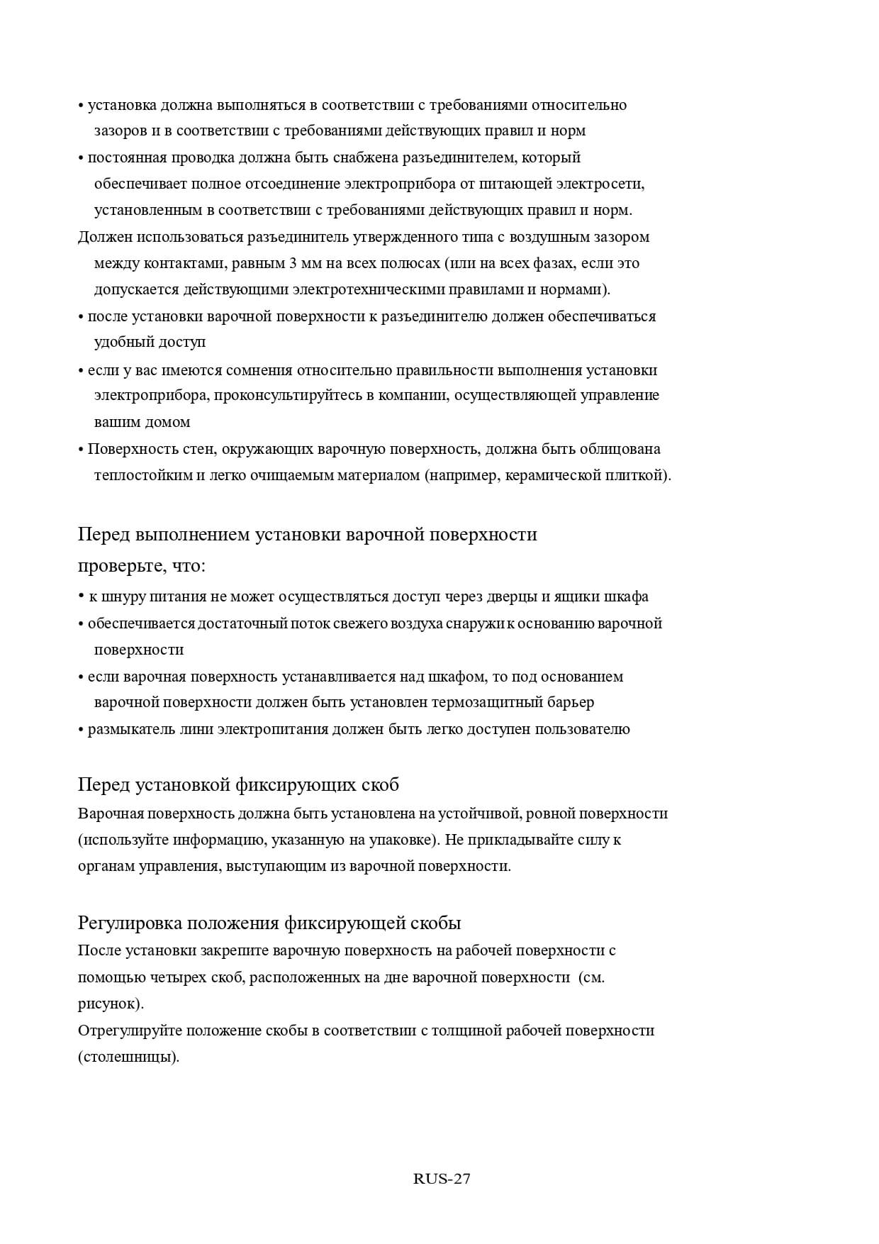 Русскоязычный текст инструкции, занимающий 31 страницу, последовательно знакомит пользователя с прибором: здесь есть всё об установке, о правильной эксплуатации, а также об управлении и уходе за панелью. Текст достаточно подробный, написан понятным языком и сопровожден иллюстрациями.