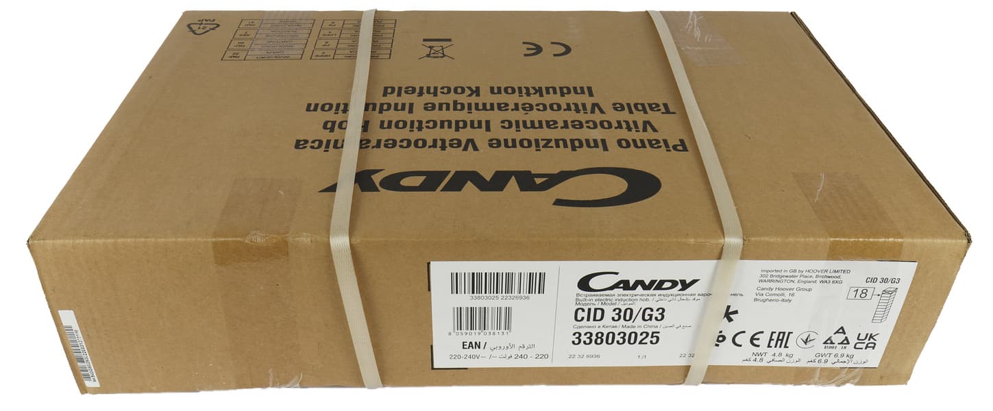 Candy CID 30/G3 упакована в плоскую коробку из коричневого картона с черно-белой полиграфией. На упаковке размещены логотип компании, наклейки с техническими характеристиками и полным названием модели, а также манипуляционные значки с информацией о необходимых условиях перевозки.