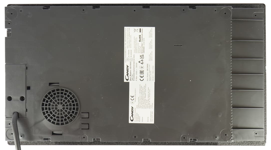 Кабель питания без вилки выходит с нижней стороны прибора. Там же располагаются отверстия вентилятора.