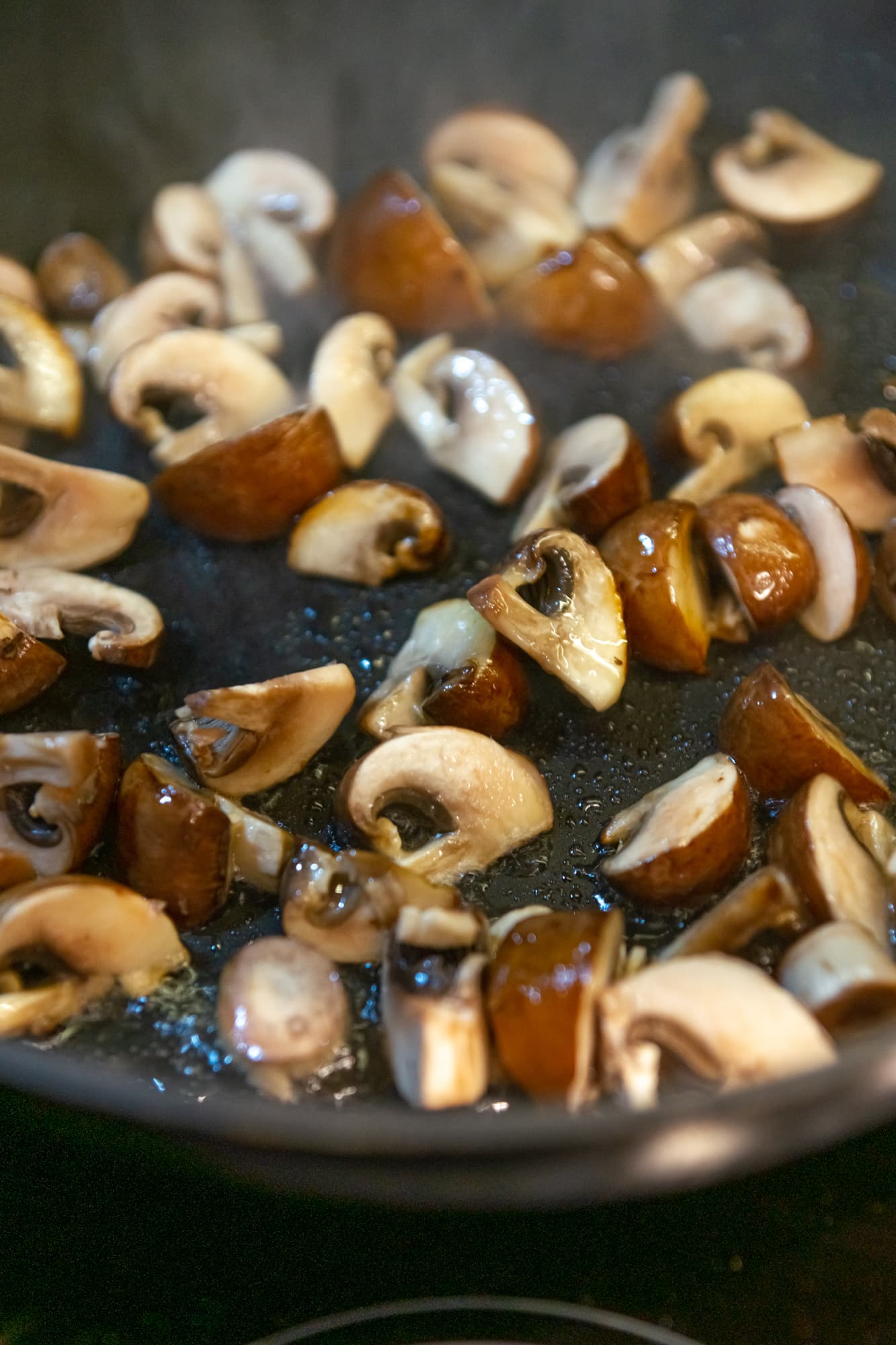 На максимальной мощности до золотистого цвета обжарили лук-порей и шампиньоны.