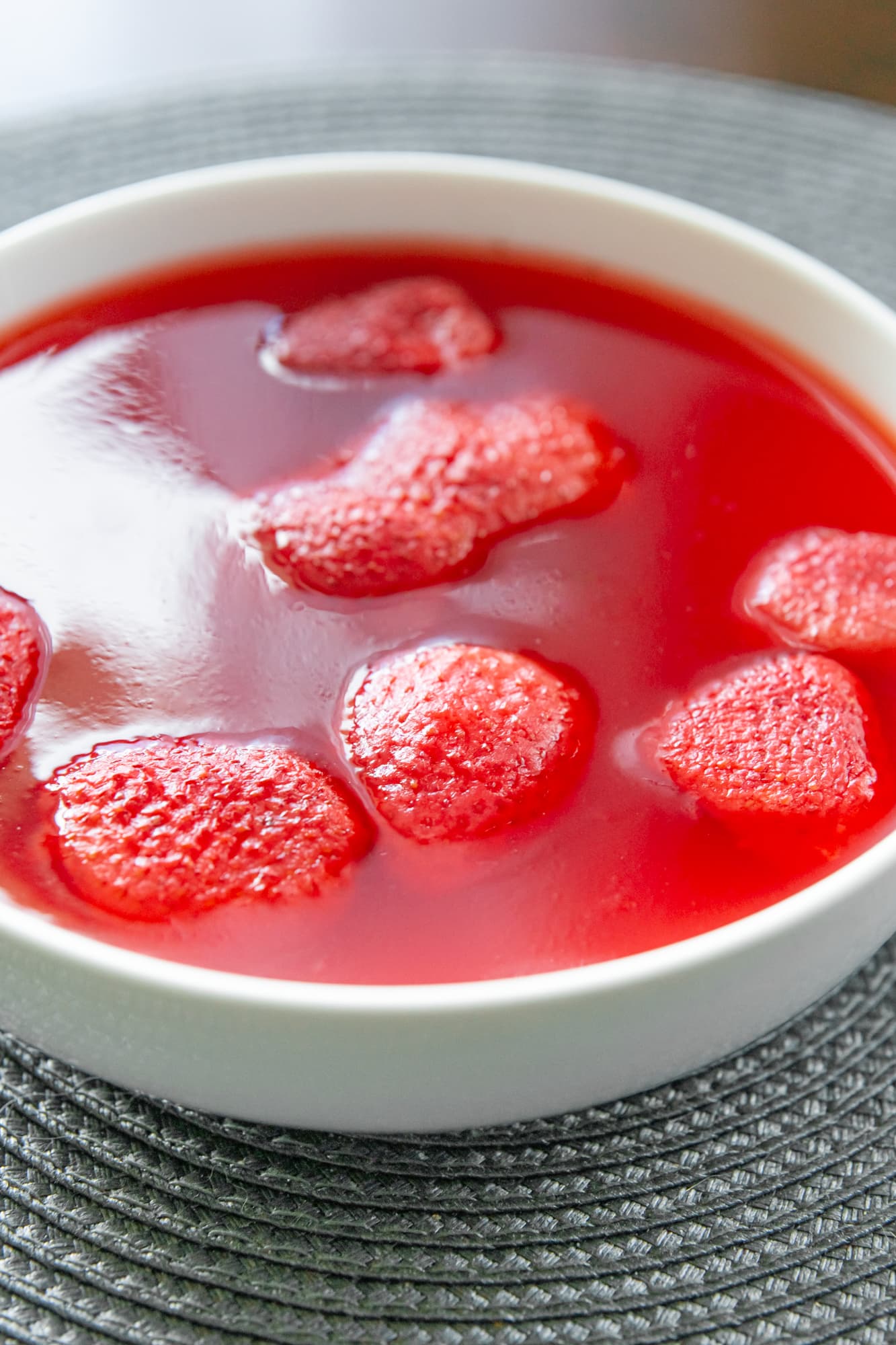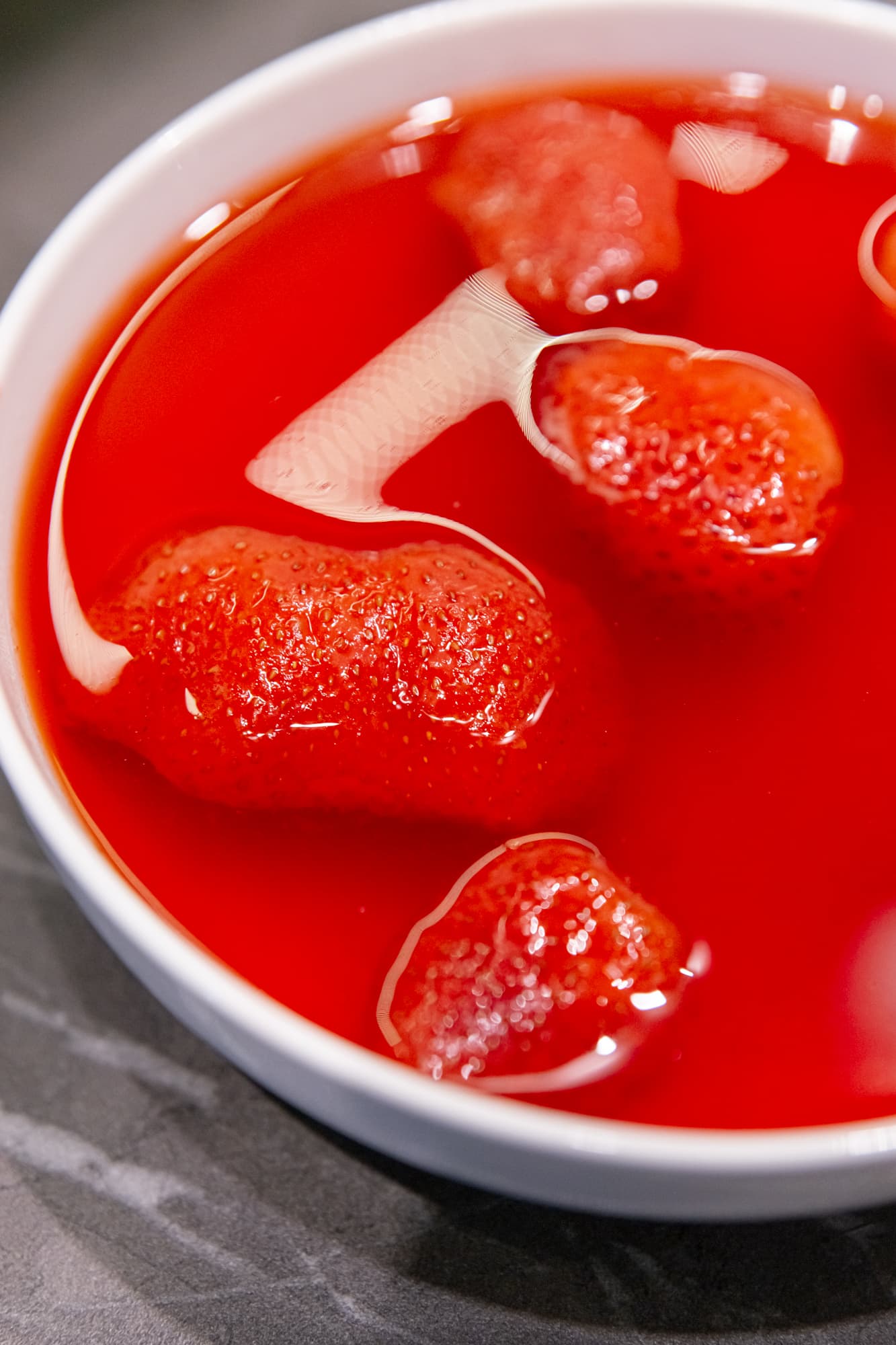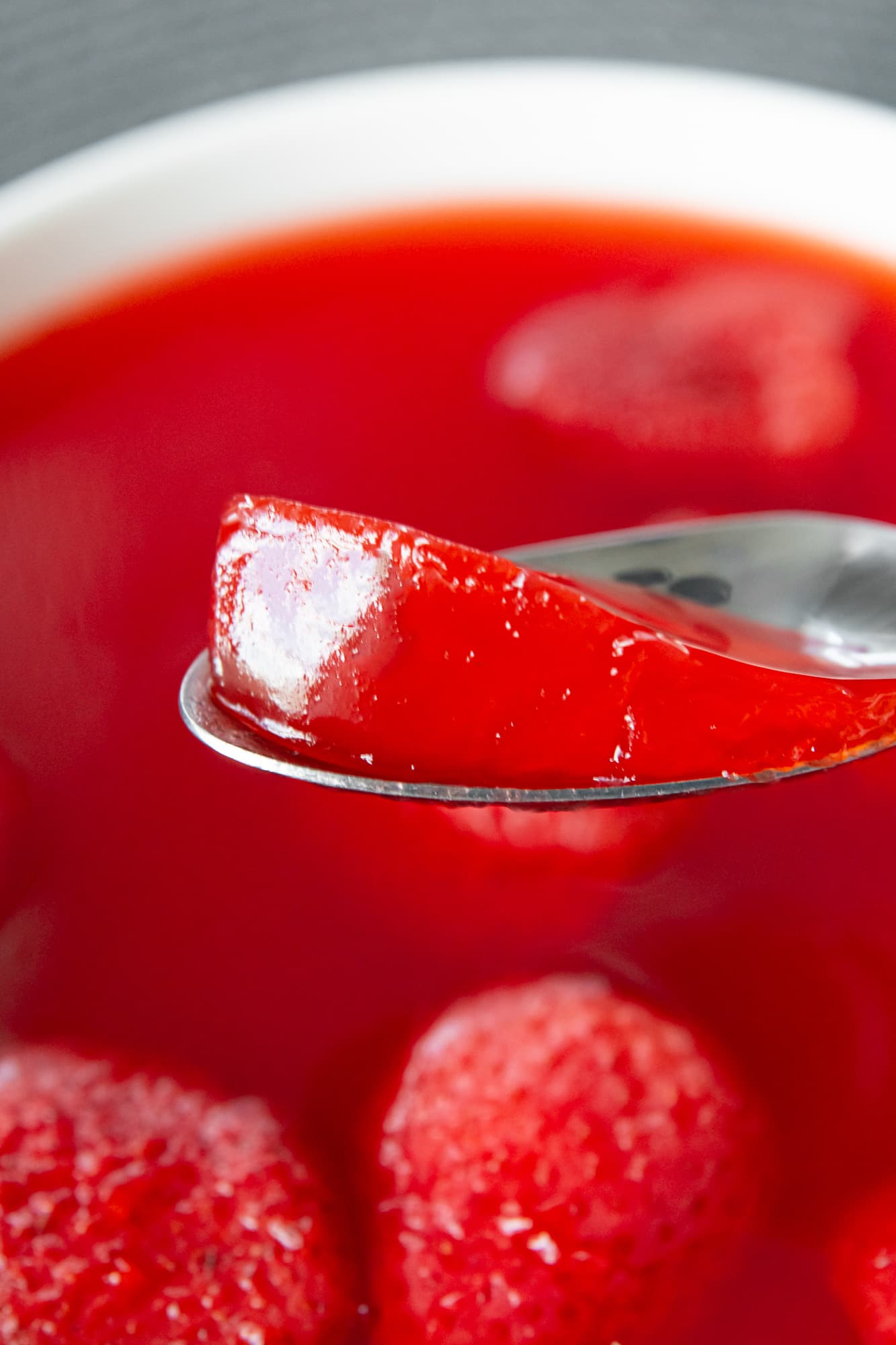 Довели до кипения, понизили нагрев до 5 и проварили компот в течение пары минут. В это время в отдельной емкости размешали 9 г агар-агара в 300 мл воды. Клубничный отвар слили через ситечко, откинув на него ягоды. Вернули сироп в кастрюлю, влили воду с агар-агаром, включили конфорку на 9, довели до активного кипения, уменьшили нагрев до 7 и проварили около двух минут при постоянном помешивании. Разлили будущее желе по емкостям и отправили в холодильник до полного застывания.