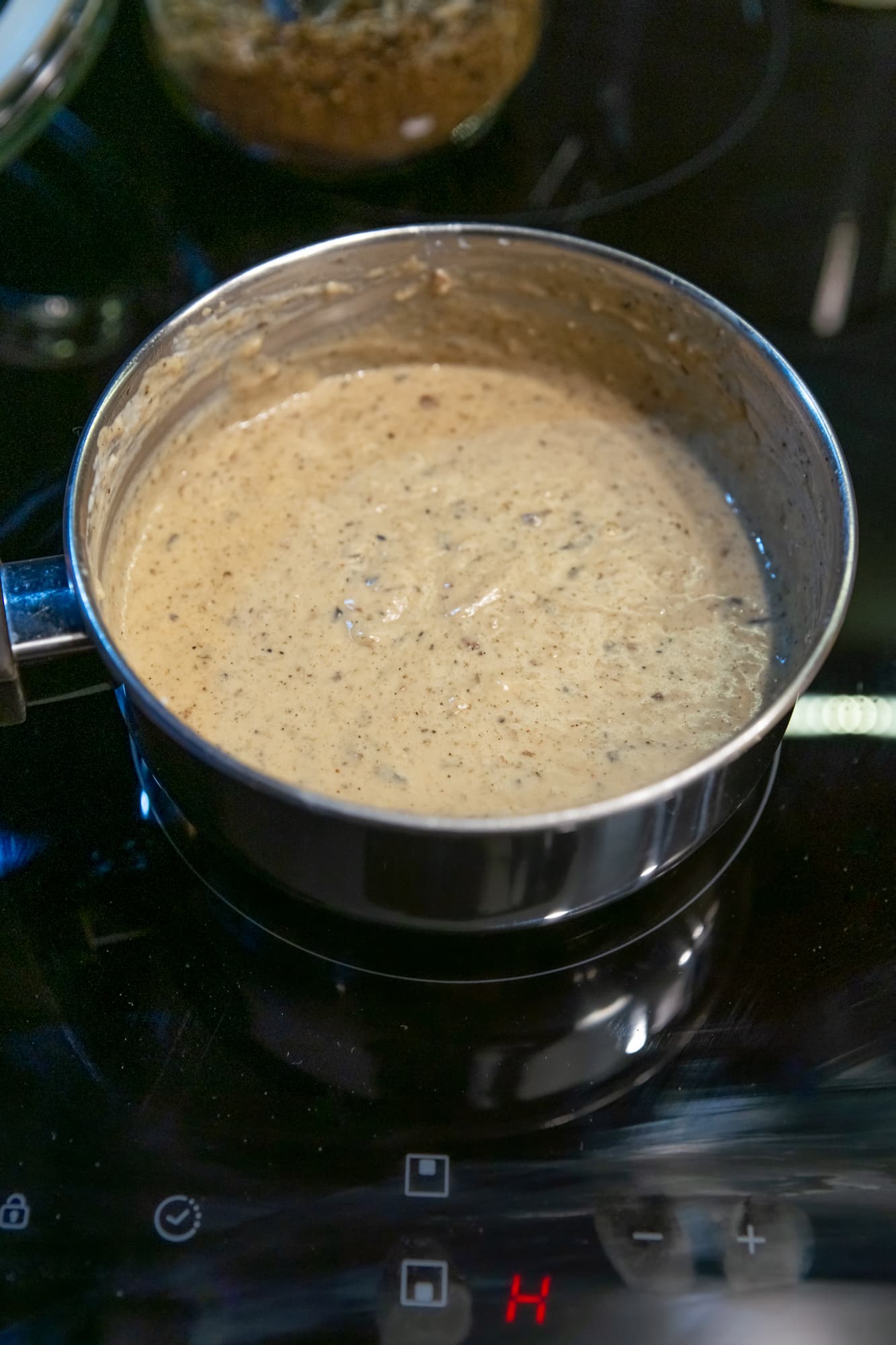 На маленькой конфорке разместили ковшик, нагрели в нем сливочное масло и добавили муку. Слегка обжарили. Непрерывно помешивая, влили бульон, подсыпали грибного порошка, соль, добавили сливки и проварили пару минут на медленном огне.