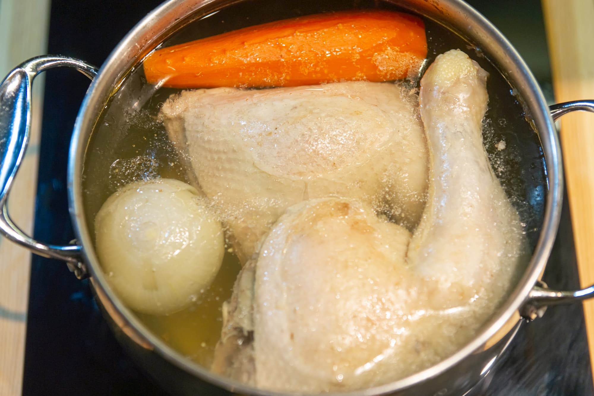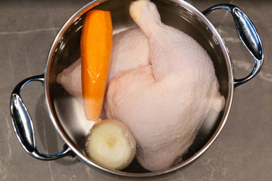 Куриные окорочка мы залили тремя литрами воды, добавили к ним морковь, луковицу, соль, перец горошком и поставили на большую конфорку закипать.