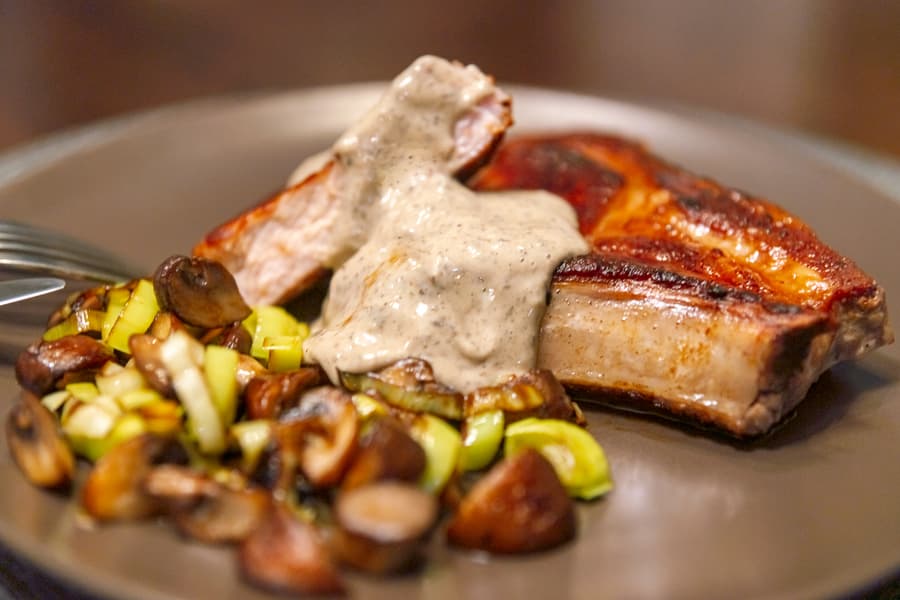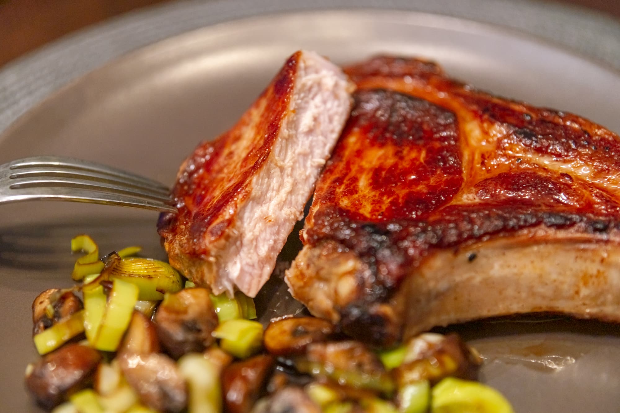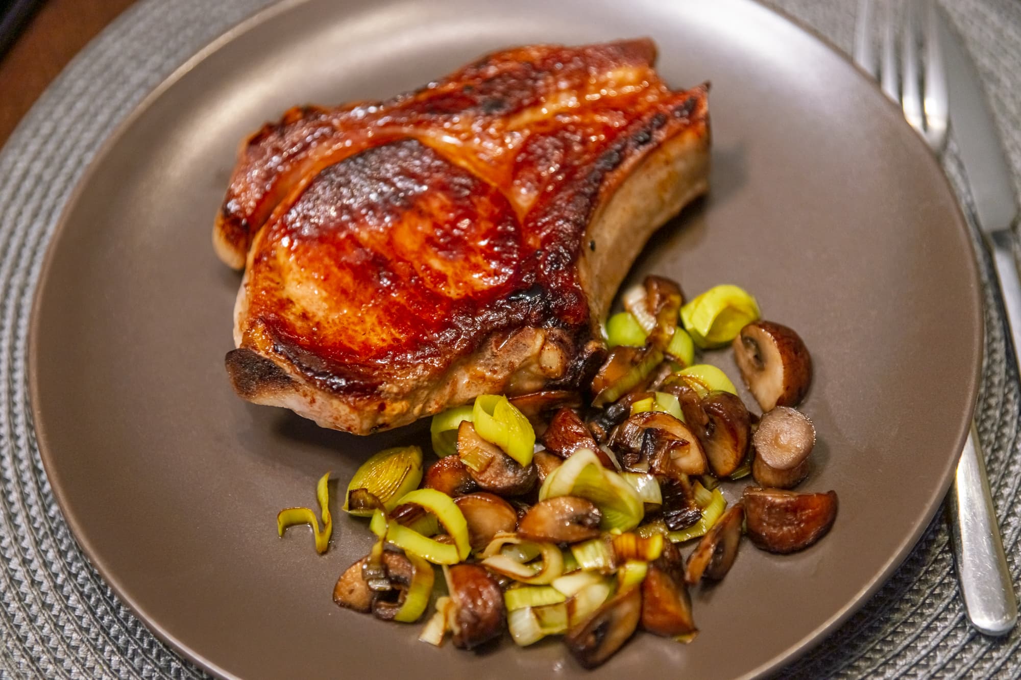 На максимальной мощности мясо приобрело красивую аппетитную корочку с обеих сторон за 8 минут. Потом мы снизили нагрев до 6, накрыли сковородку крышкой и довели свинину до готовности. На это ушло еще 5 минут.