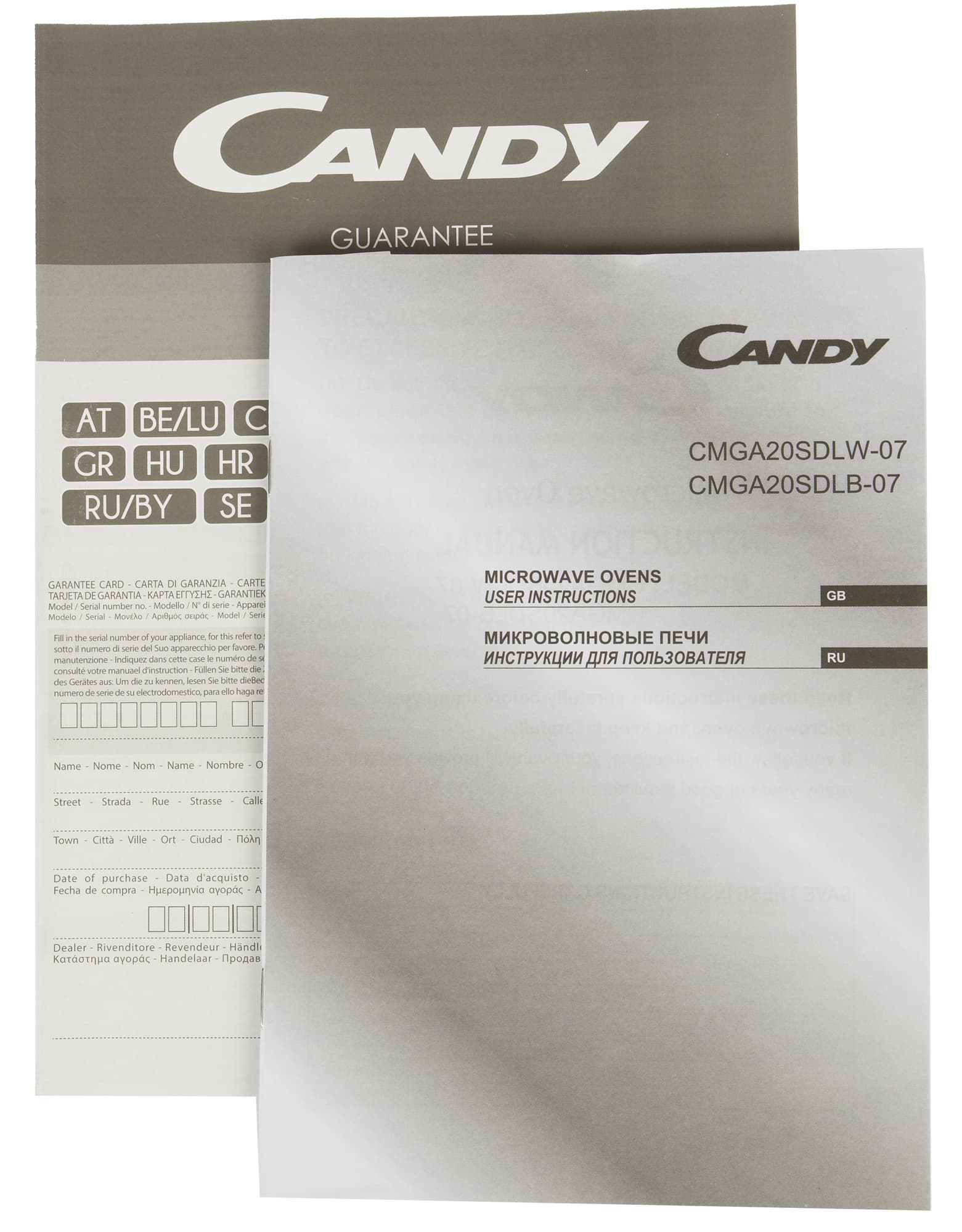 Candy CMGA20SDLB-07 — отдельностоящая микроволновая печь с 20-литровой рабочей камерой, поворотным столом, 8 автопрограммами, грилем, функцией отложенного старта, возможностью установки поэтапного приготовления на 2 шага и блокировки панели управления от детей. Мощность микроволн прибора составляет 700 Вт, а гриля — 1000 Вт.