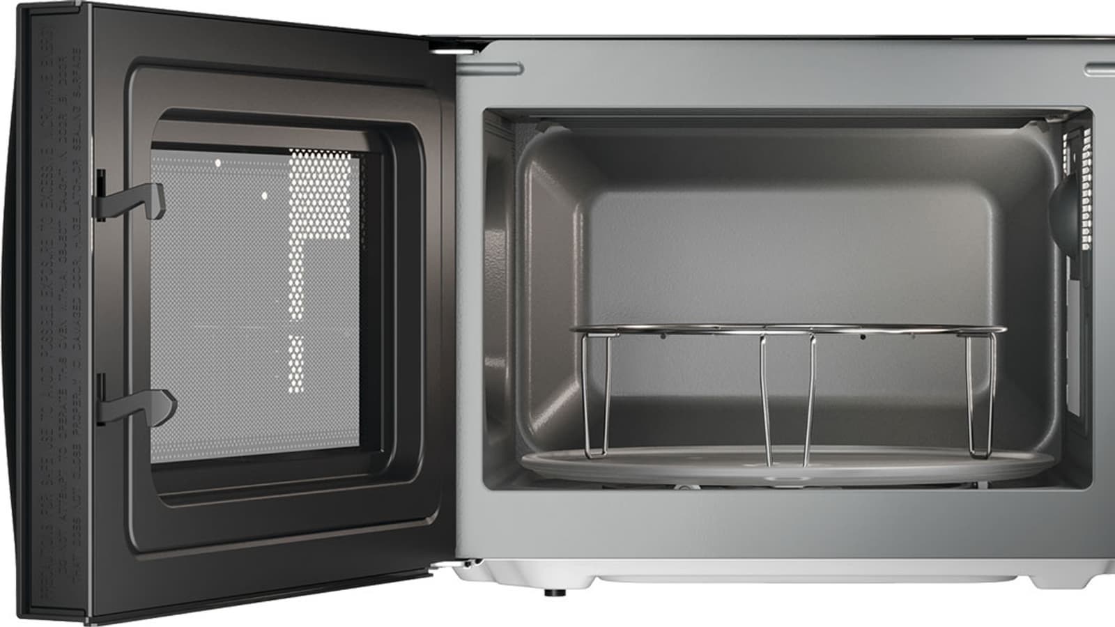 Корпус микроволновки, как и внутреннюю камеру и дверцу изнутри, следует протирать мягкой влажной тканью или губкой с использованием нейтрального моющего средства. Стеклянный поддон промывается в мыльной воде под краном. Использование жестких, абразивных средств и металлических мочалок категорически запрещено.
