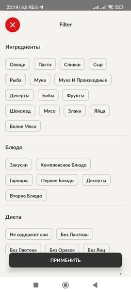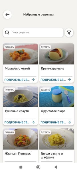 Допустим, мы выставили фильтр по двум категориям: блюда из рыбы и вторые блюда. Приложение предлагает нам следующие рецепты: