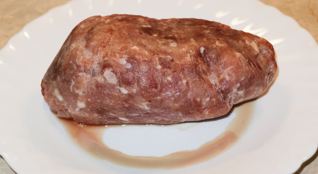 По завершении времени вынули фарш, счистили с него разморозившуюся часть, которой оказалось не так много — мягкий фарш в основном был снизу и посередине кома. Оценили остаток и решили продолжить разморозку, задав минимальное возможное количество продукта — 100 г. Печь рассчитала, что ей потребуется 5 минут 30 секунд.
