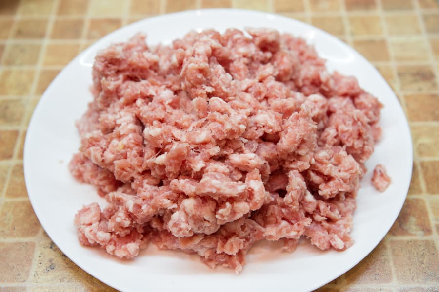 Для традиционного теста мы взяли 800 г свежего домашнего фарша, слепили из него шар и отправили на сутки в морозилку.