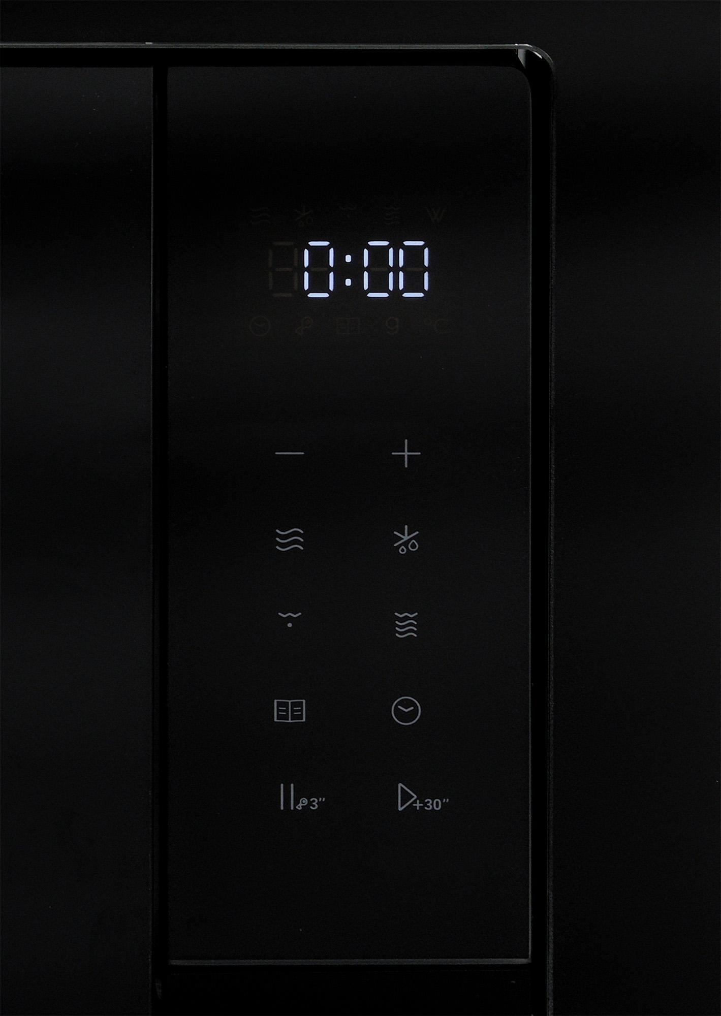 Первые два сенсора — «−» и «+» — помогают настроить часы и длительность цикла приготовления. Ниже находятся сенсоры выбора одного из 8 уровней мощности микроволн (от 100 до 800 Вт) и режимов разморозки — по весу (от 100 до 2000 г) или по времени.