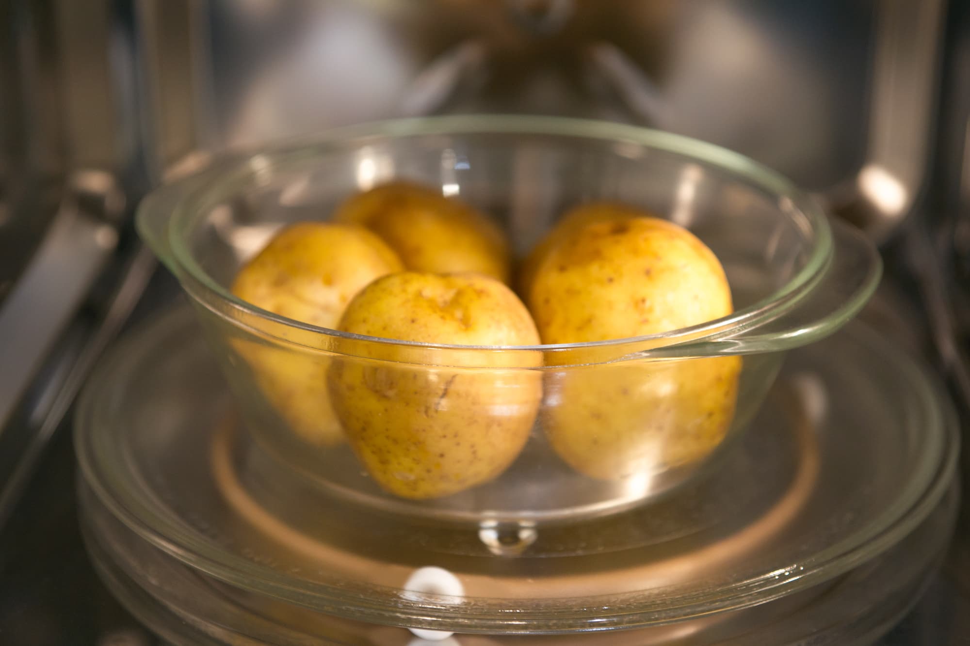 Тщательно вымыли несколько средних картофелин, проткнули их вилкой и уложили в стеклянную емкость.