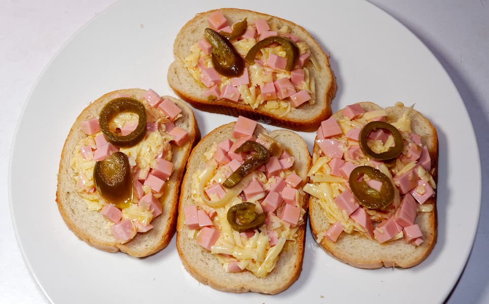 Горячие бутерброды «из того, что нашлось в холодильнике». В обычном холодильнике, как правило, «находится» колбаса, сыр, яйца и еще что-нибудь (в нашем случае мы нашли консервированные перчики халапеньо).