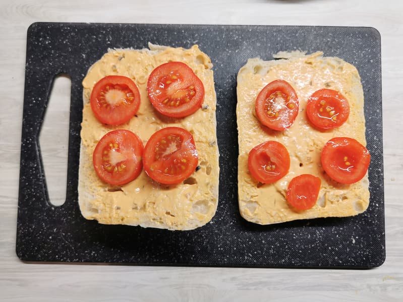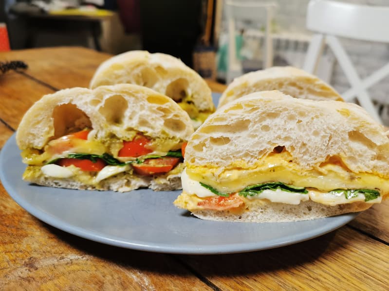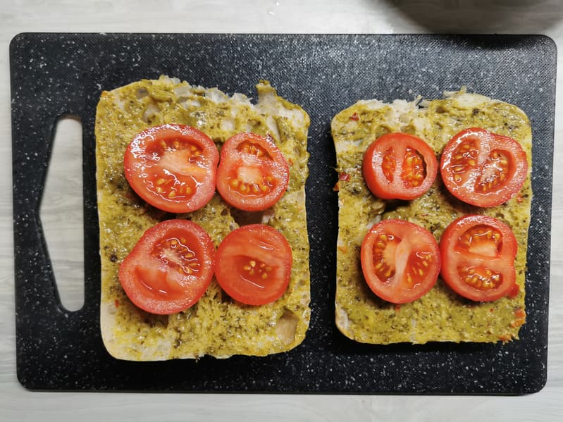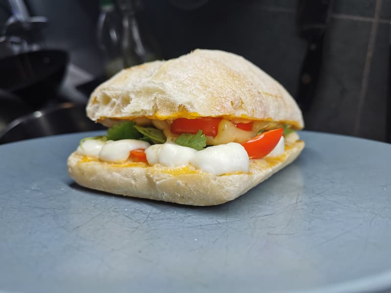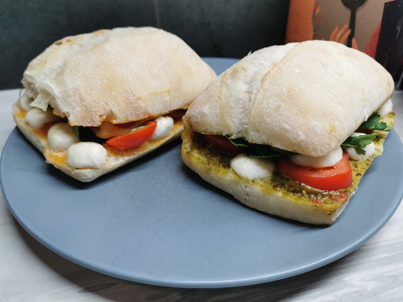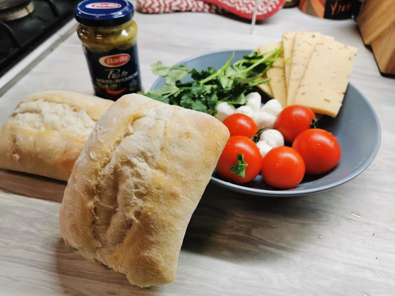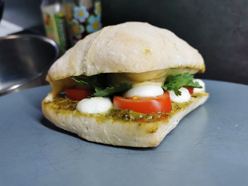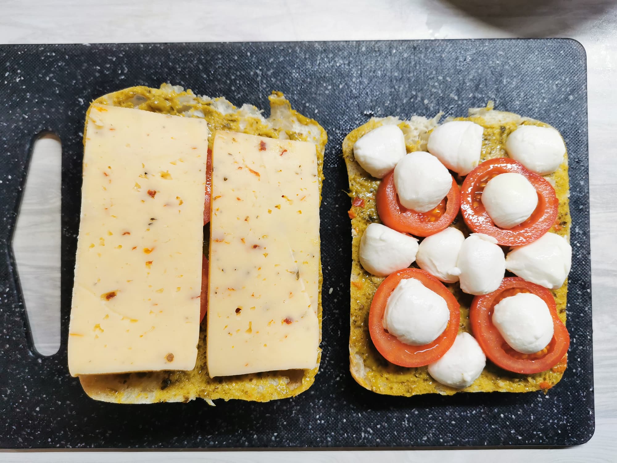 Для теста режима гриля мы решили приготовить два сэндвича с чиабаттой, томатами, моцареллой, сыром, кинзой и двумя разными соусами — для бургера и острым песто.