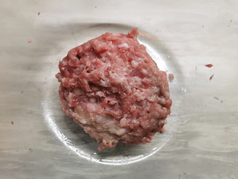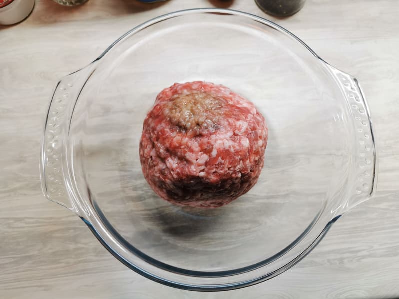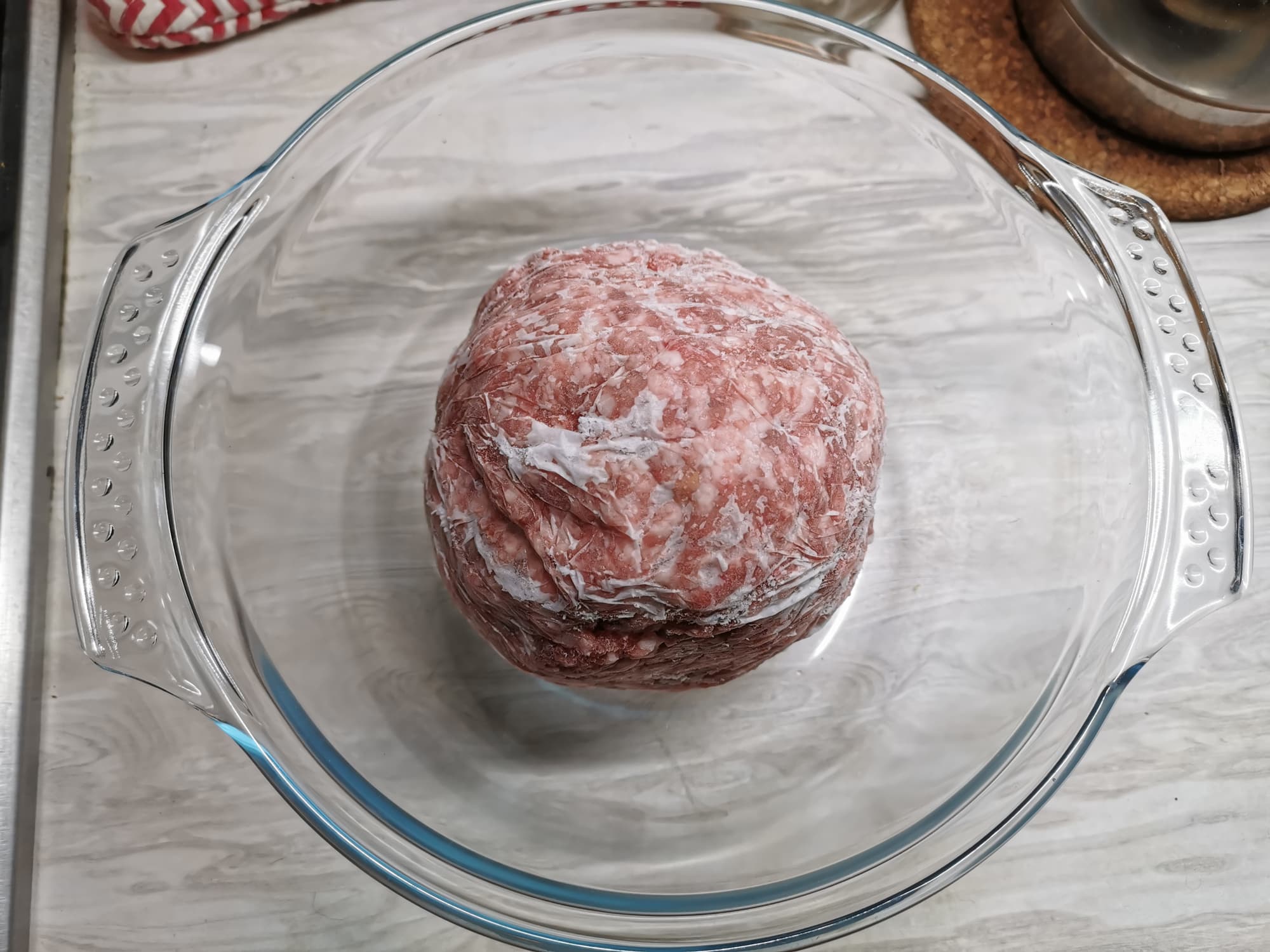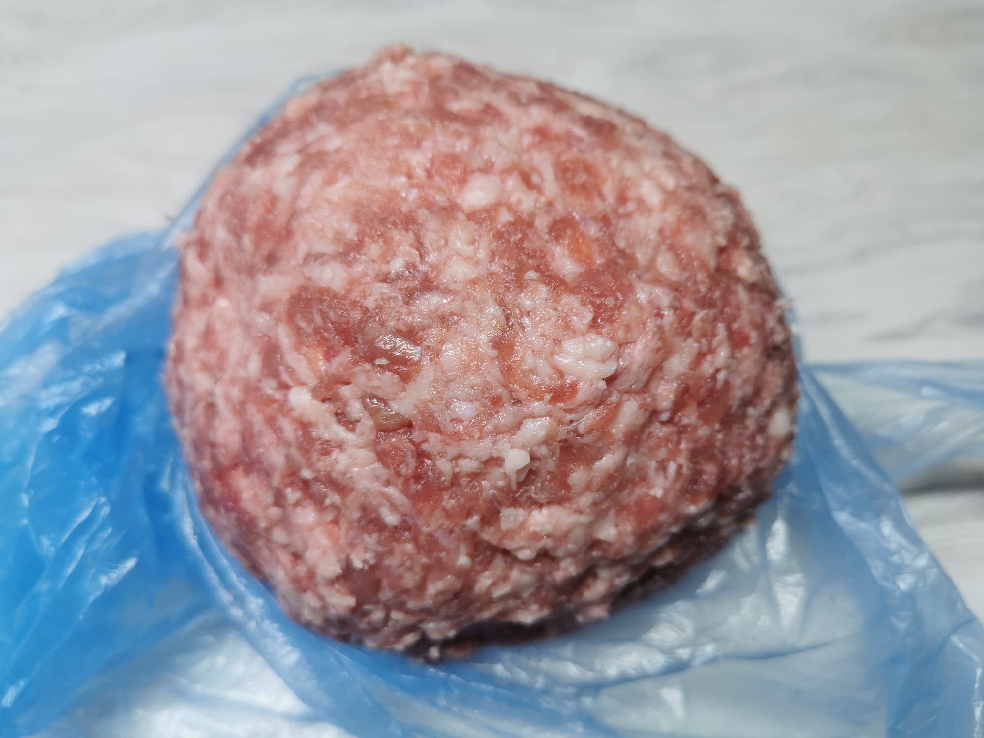 Для теста мы взяли 800 г свежего фарша, слепили из него шар и заморозили.