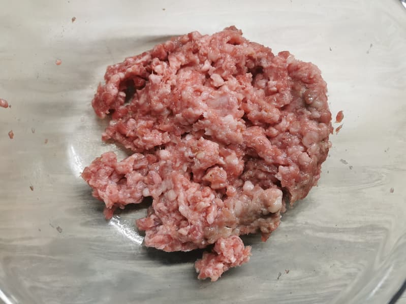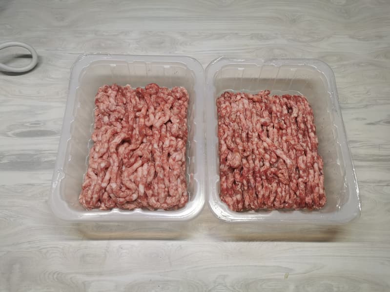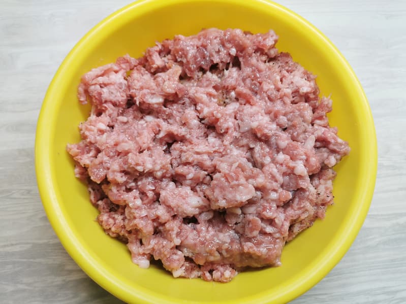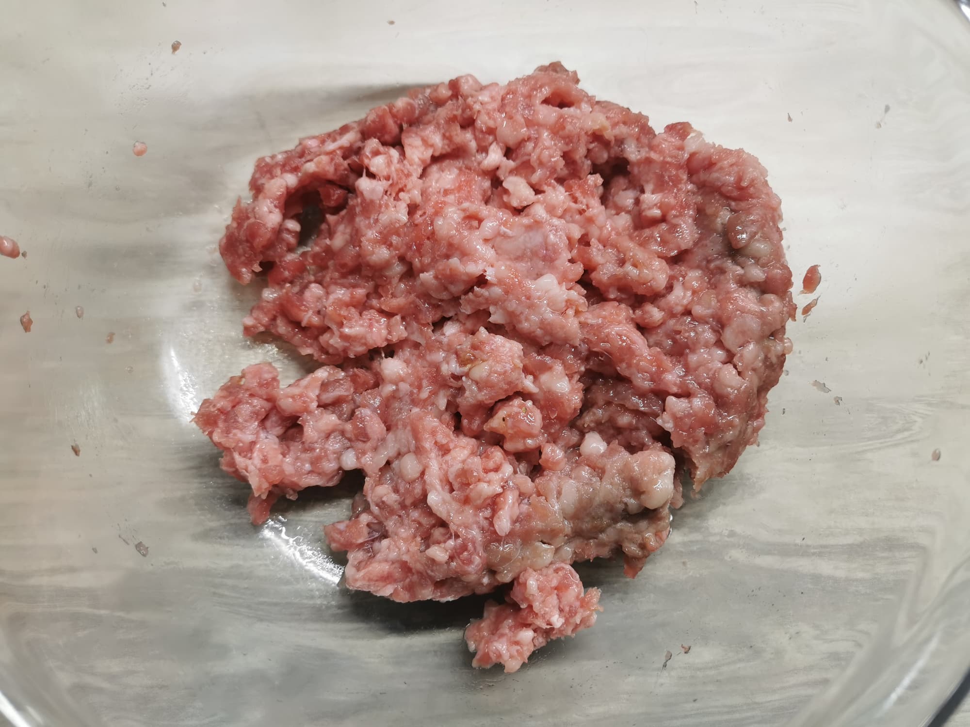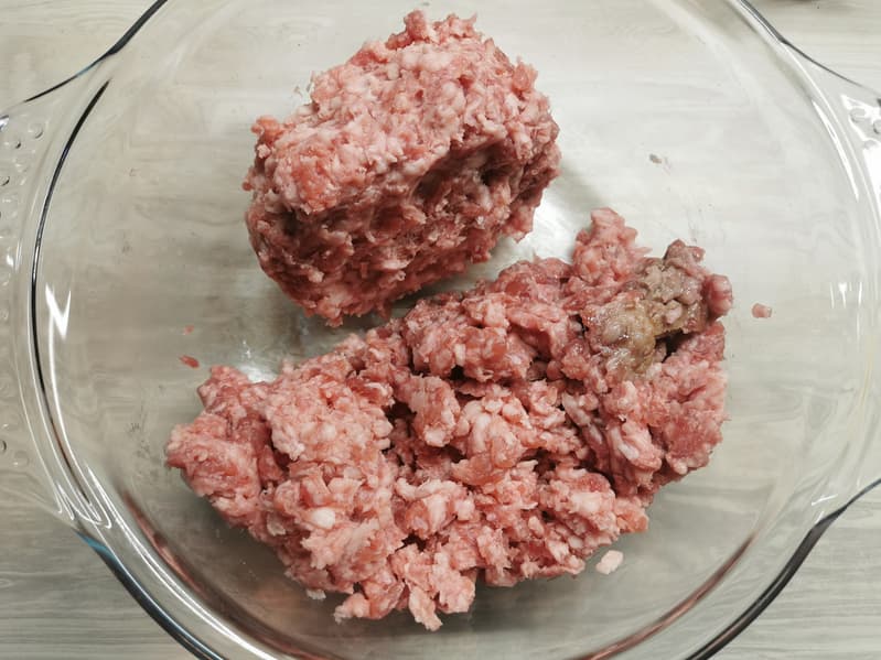 Для теста мы взяли 800 г свежего фарша, слепили из него шар и заморозили.