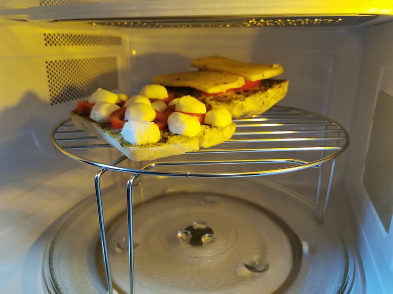 После чего сразу выложили на решетку для гриля и отправили в микроволновую печь в режиме «C-2» с соотношением 36% микроволн к 64% гриля. Время приготовления мы указали 20 минут.