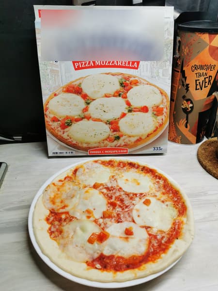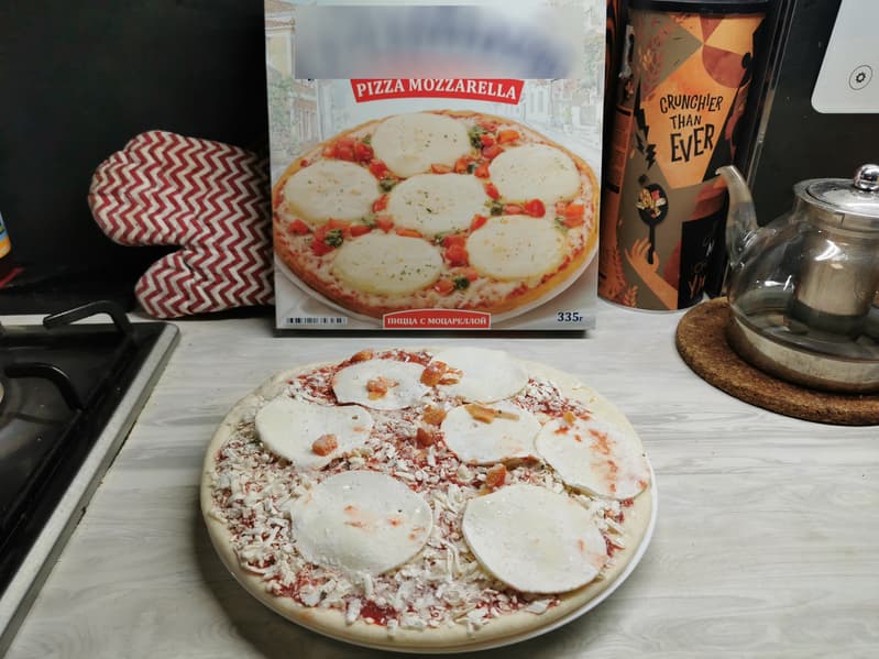Одним из 40 автоматических режимов микроволновой печи является режим «Пицца», рассчитанный на пиццу весом 200 г. Мы решили испытать данную программу и взяли замороженную пиццу весом 335 г.