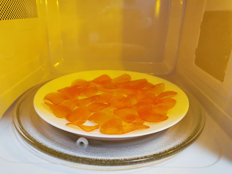 Но, вероятно, мы положили слишком много чипсов на одну тарелку, так как некоторые из них имели все еще плотные края. Поэтому мы решили запустить еще одну порцию поменьше с прежней мощностью 80% и уже на две минуты вместо трех.