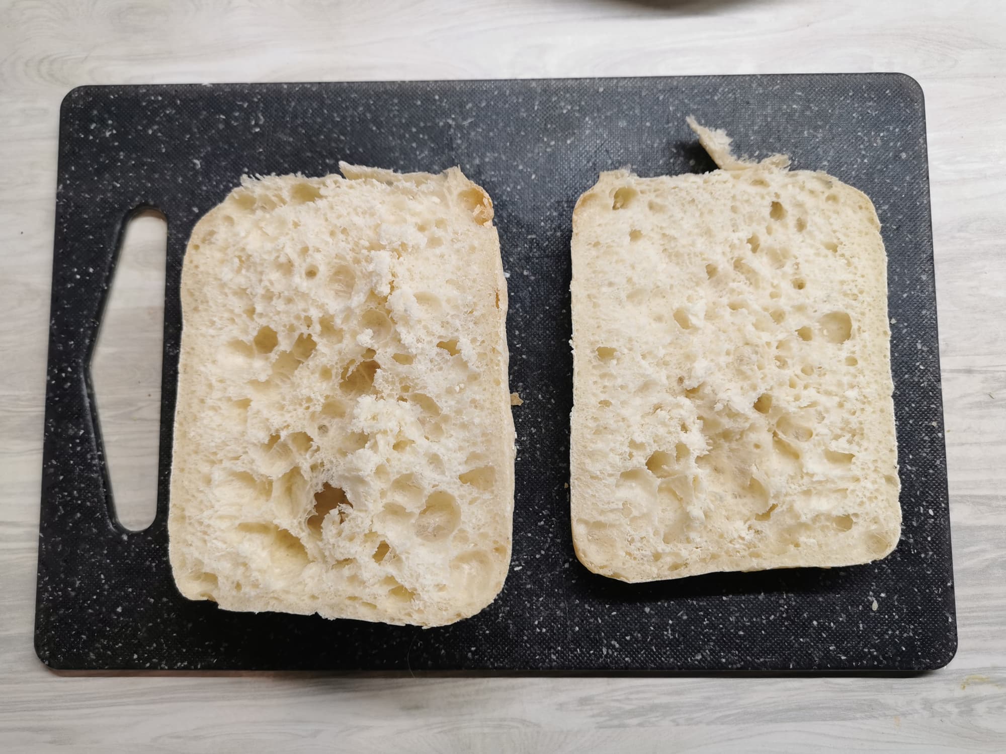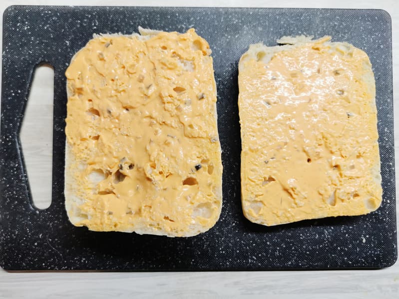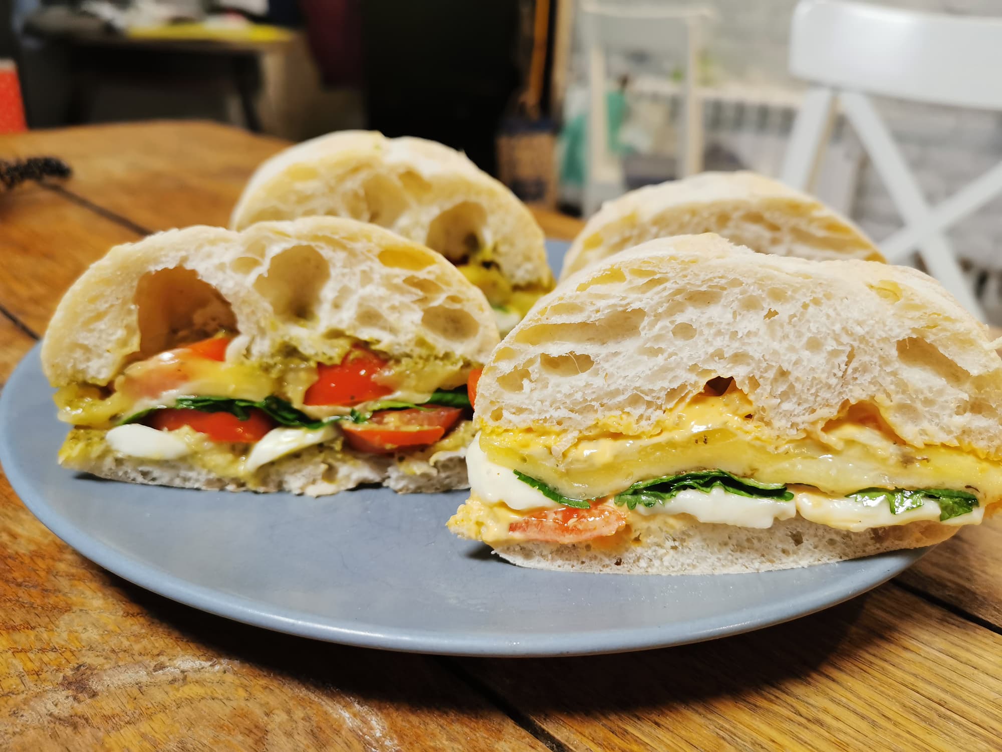 Мы разрезали каждую чиабатту вдоль. В первом сэндвиче поочередно намазали каждую половинку соусом и уложив все ингредиенты слоями.