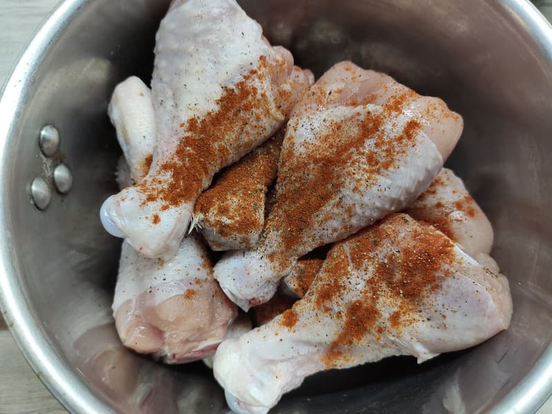 Мы взяли свежие куриные ножки, обваляли их в молотой копченой паприке, молотом черном перце и соли.