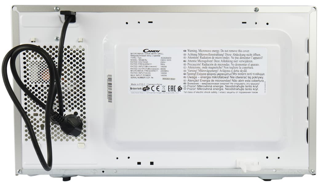 Если посмотреть на печь сзади — мы видим технические и вентиляционные отверстия, вывод шнура и сам шнур с вилкой, значительно выгнутый назад защитный экран и наклейку с краткой технической информацией об устройстве.