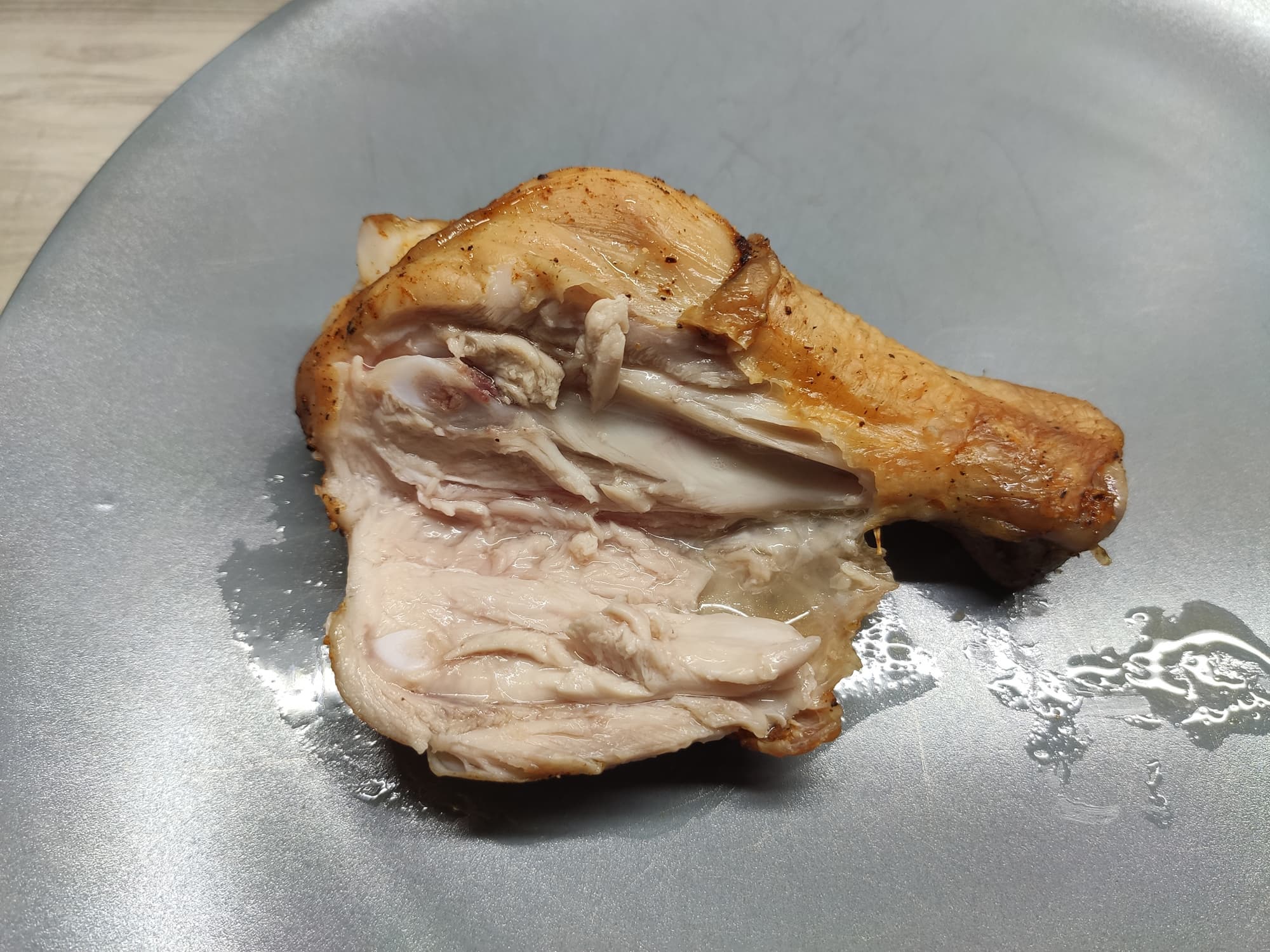 Мы разрезали одну из ножек, чтобы проверить готовность, и остались удовлетворены результатом — мясо получилось сочным и пропеченным вплоть до кости.