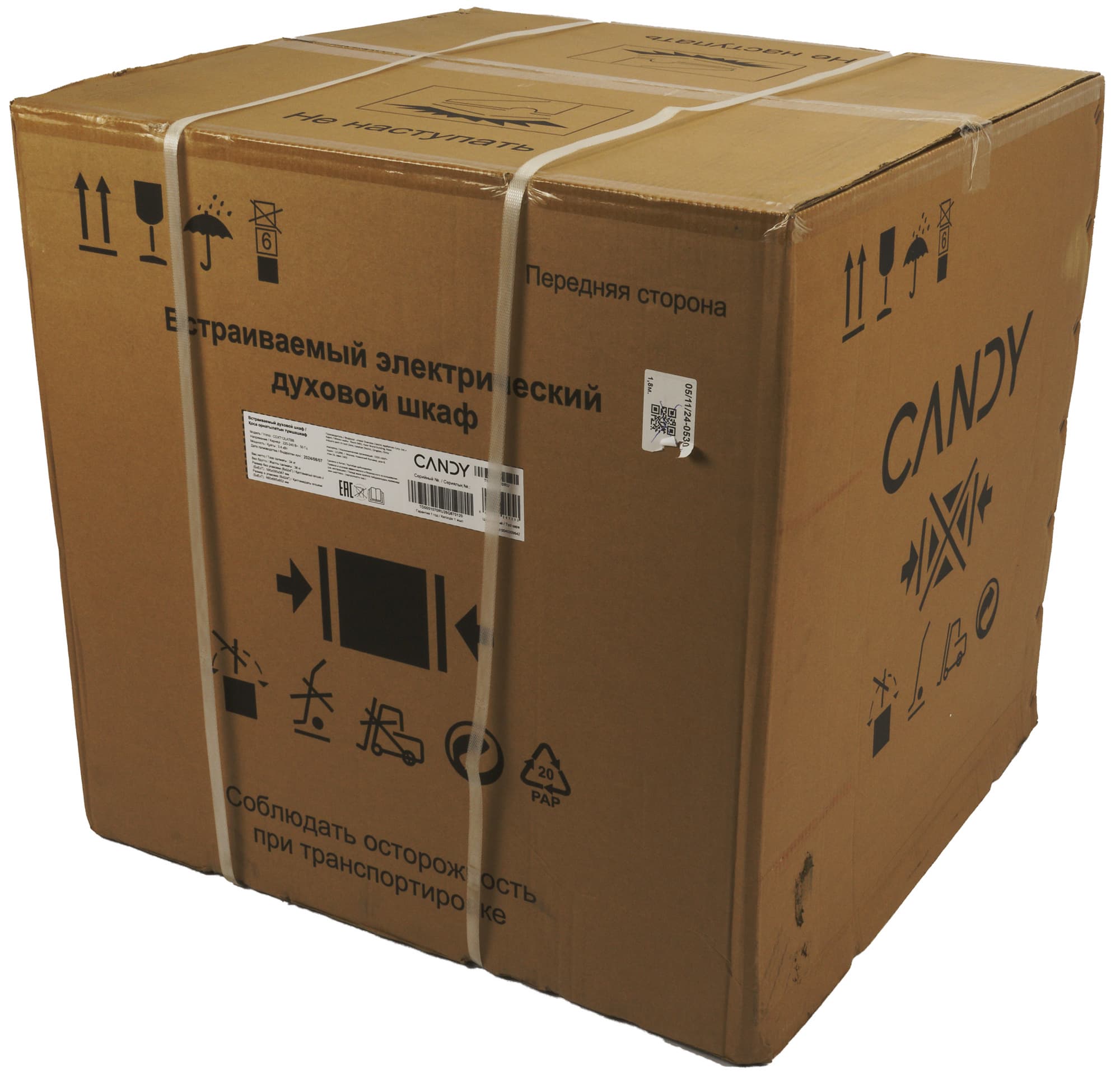 Духовой шкаф Candy COXT12LATBB поставляется в коробке из прочного коричневого картона стянутой пластиковой лентой. На гранях упаковки размещены логотип компании, информация о модели, а также ряд транспортировочных значков.