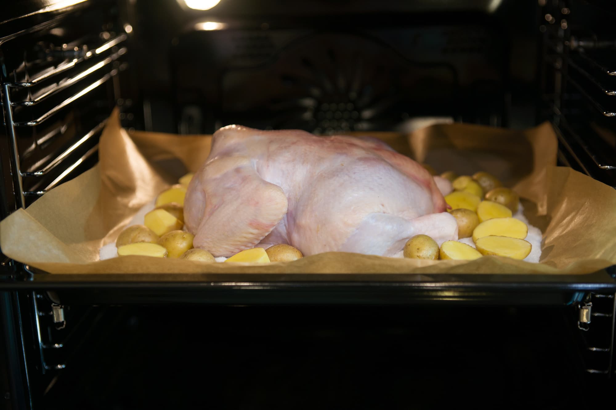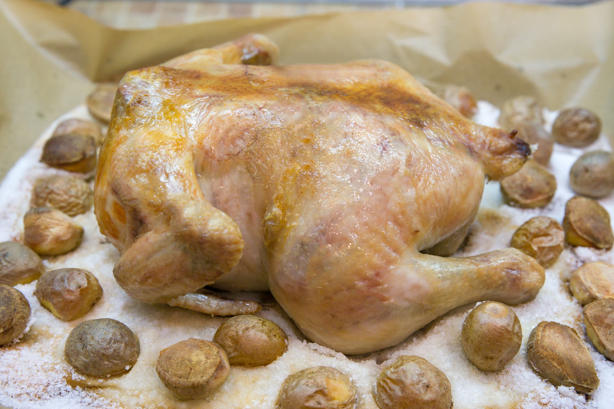 Нагрели духовку в режиме верхнего и нижнего нагрева с конвекцией до 180 °C. Высыпали на противень около 700 г соли, разровняли, в центр уложили курицу, а вокруг — небольшие картофелины.