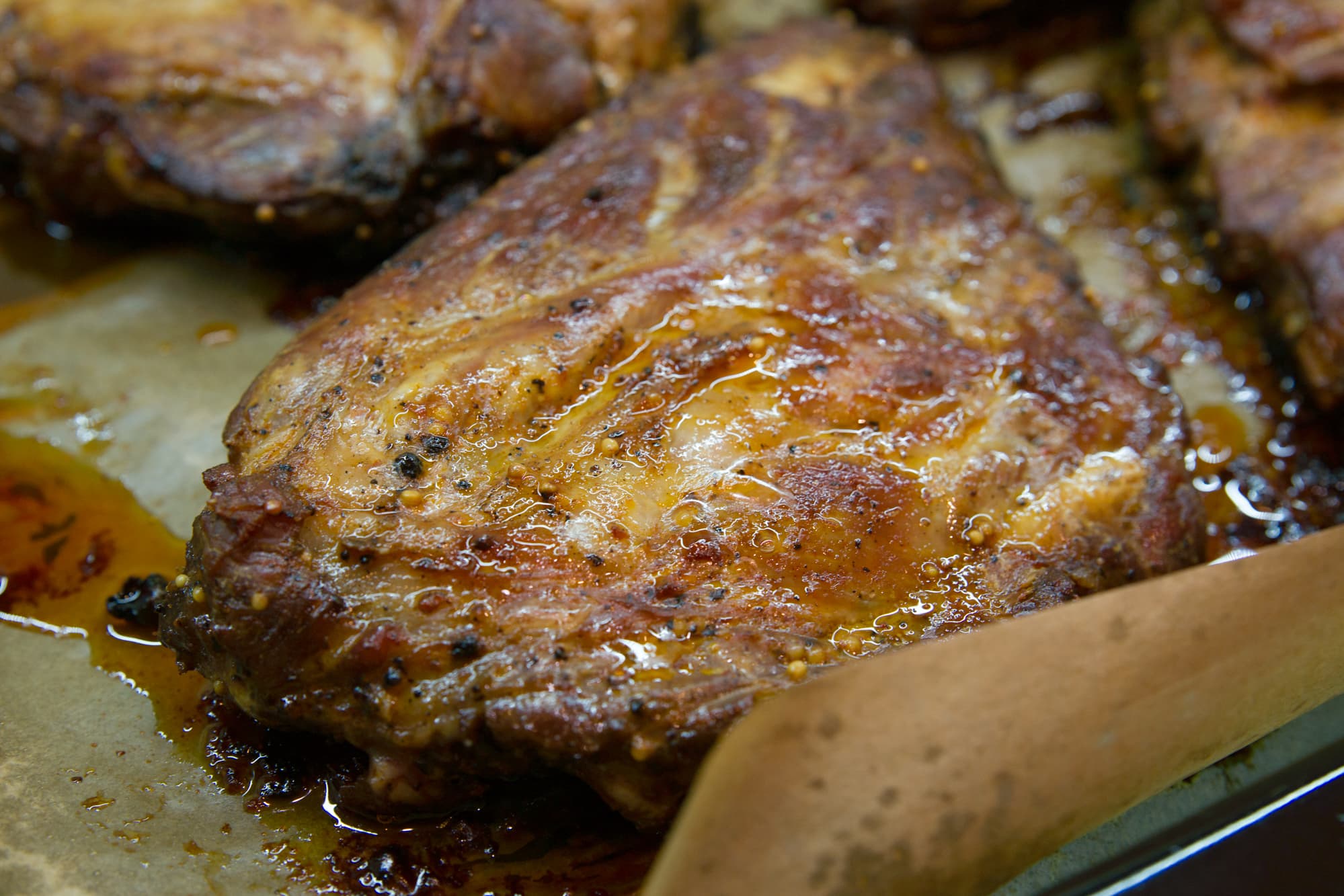 Следом в разогретую уже до 200 °C камеру отправились крупные свиные ребра, обмазанные специями и томатным соусом.