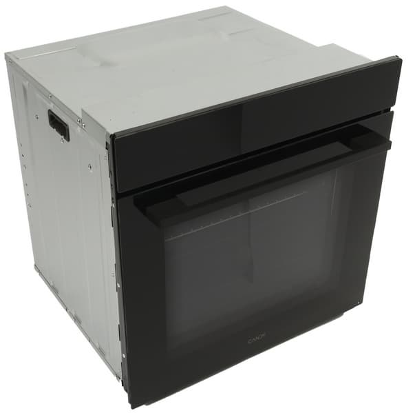 Конструкцию корпуса Candy COXT12LATBB можно назвать классической для современных электрических духовок. Фасад выполнен из черного глянцевого стекла, на нем никаких кричащих деталей, все очень строго, красиво и солидно. Только в самом низу мы видим обновленный логотип компании, нанесенный на стекло краской приглушенного светло-серого цвета. Блок управления, традиционно расположенный в верхней части полностью сенсорный.