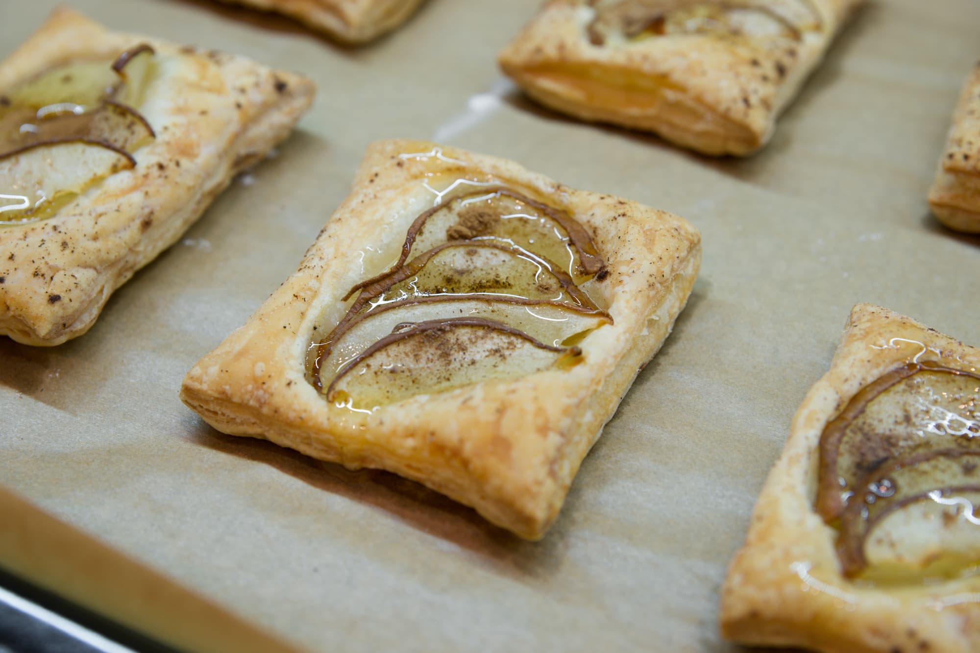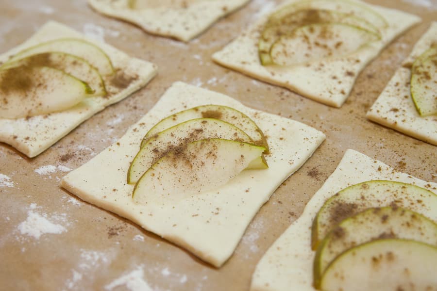 Пару пластов слоеного бездрожжевого теста, не раскатывая, нарезали на крупные прямоугольники. Выложили на каждый по несколько долек груши, присыпали корицей и мускатным орехом.