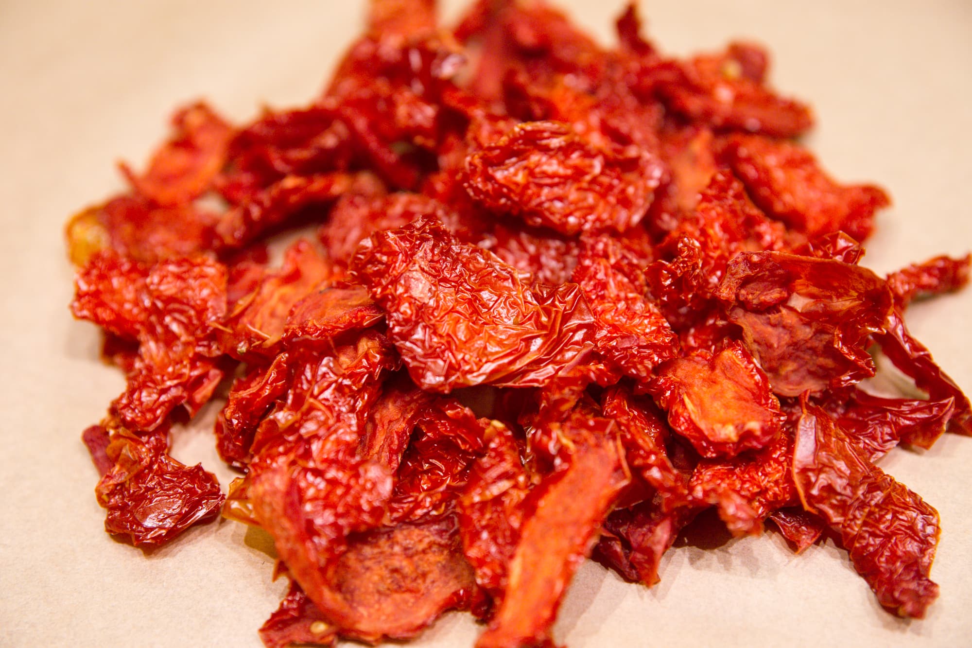 Примерно через 6 часов мы сняли первые самые маленькие дольки, а еще через 2 — и остальные, более крупные. Томаты отлично провялились и остались гибкими. В процессе мы не меняли их местами, всё высушилось абсолютно равномерно.