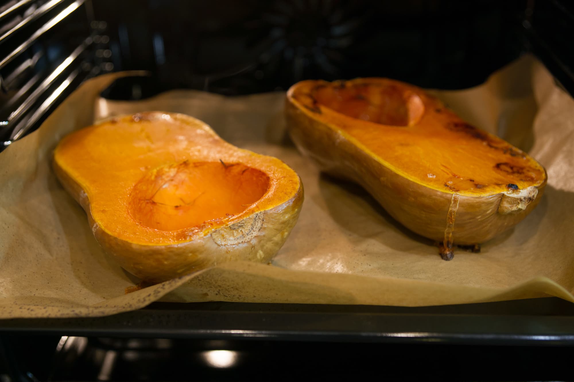 Крупную, весом почти 4 кг, тыкву разрезали пополам и запекли в режиме верхнего и нижнего нагрева при температуре 180 °C. На это понадобился ровно час.