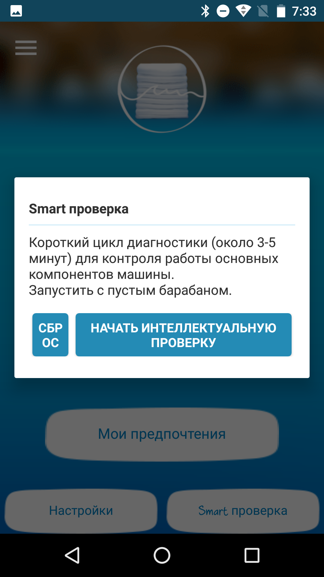 Функция «Smart проверка» позволяет провести четырехминутный тест работы блокировки дверцы, электродвигателя, тэна и других систем устройства. Для включения в этом режиме барабан должен быть пуст, а его крышка закрыта.