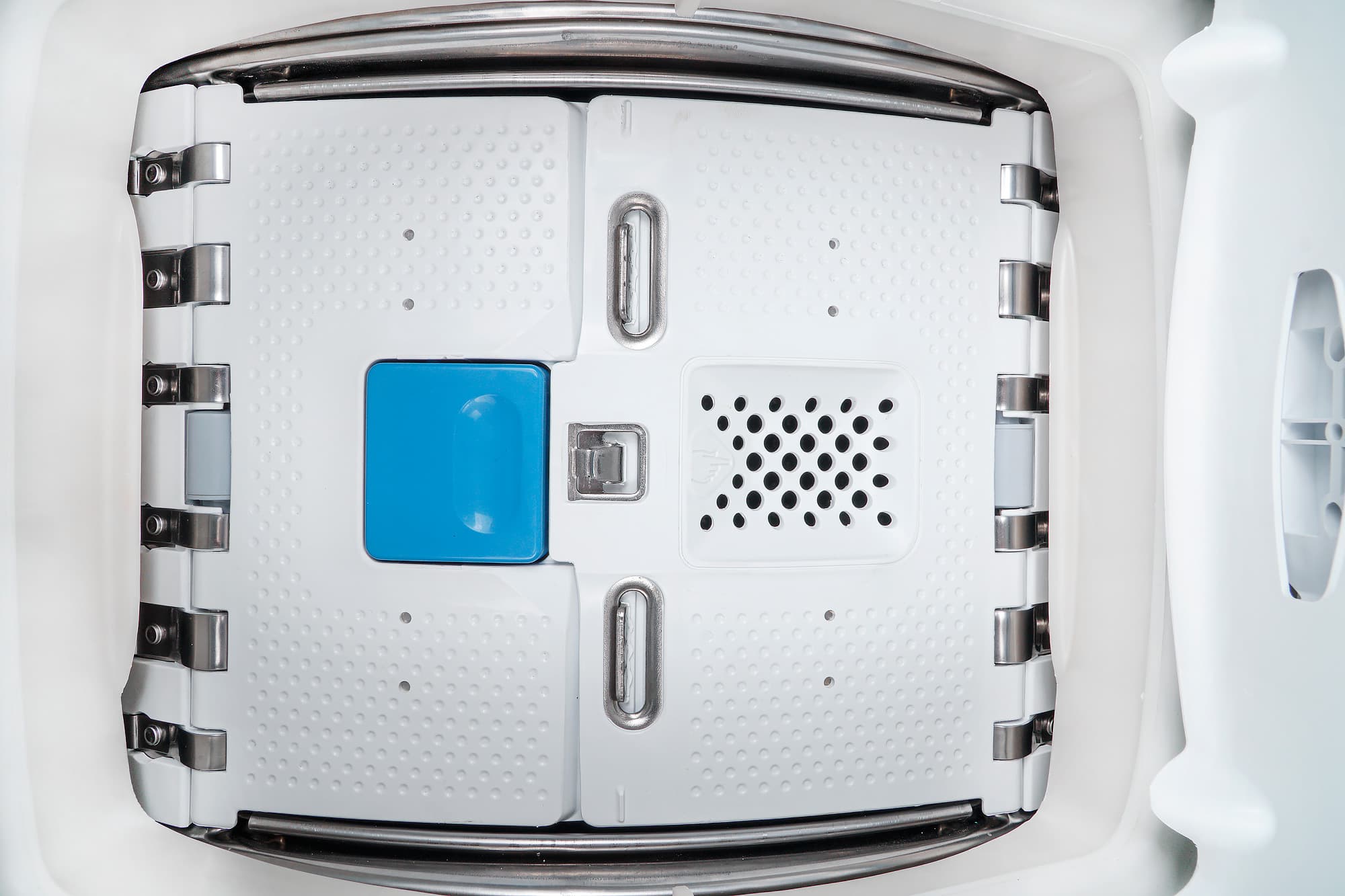 У контейнера для моющих средств три отсека: слева для стирального порошка, справа — для жидких моющих средств и в середине — для кондиционера. Чтобы его почистить, надо нажать на синюю клавишу в верхней части: тогда емкость отделится от крышки бака.