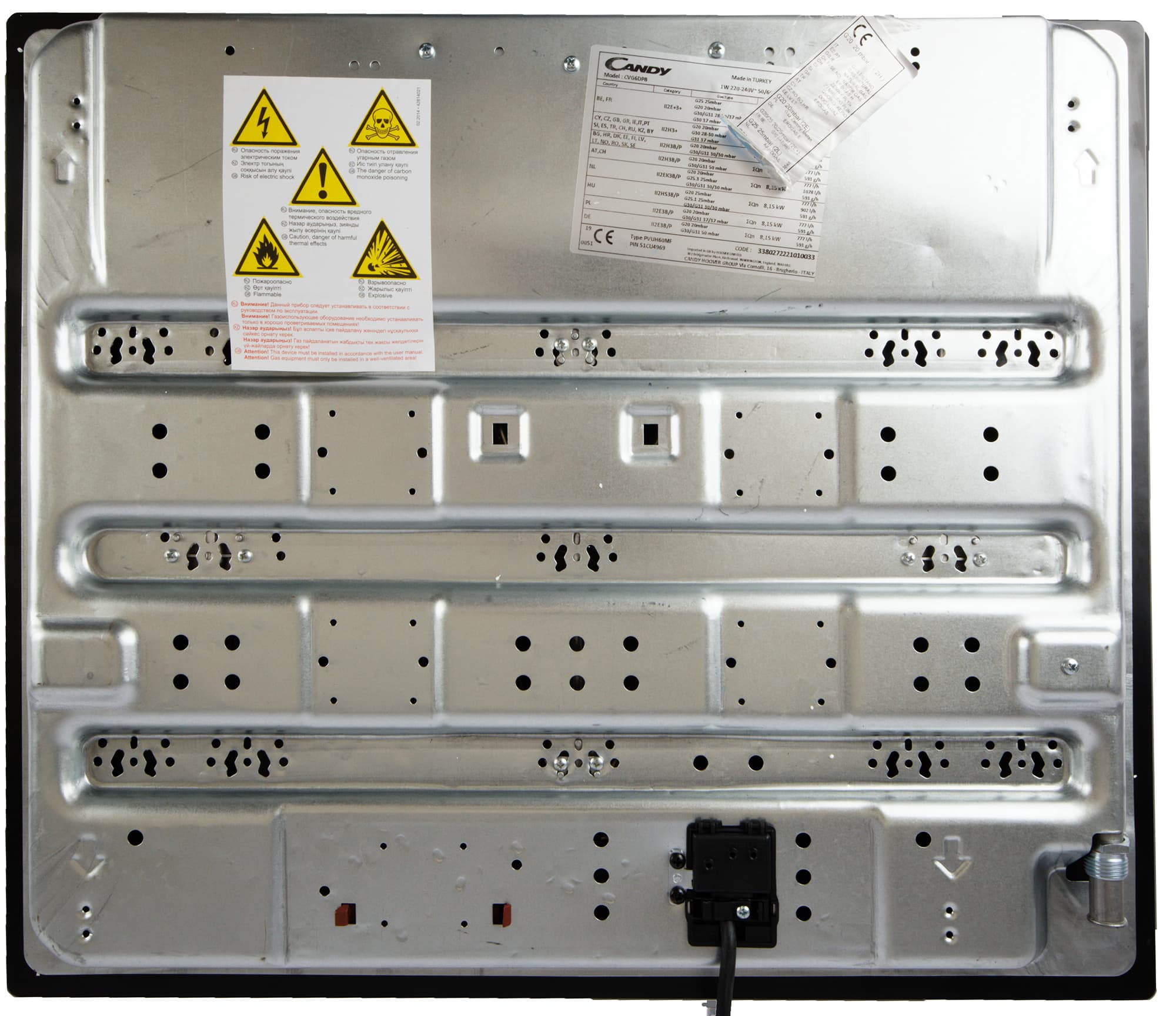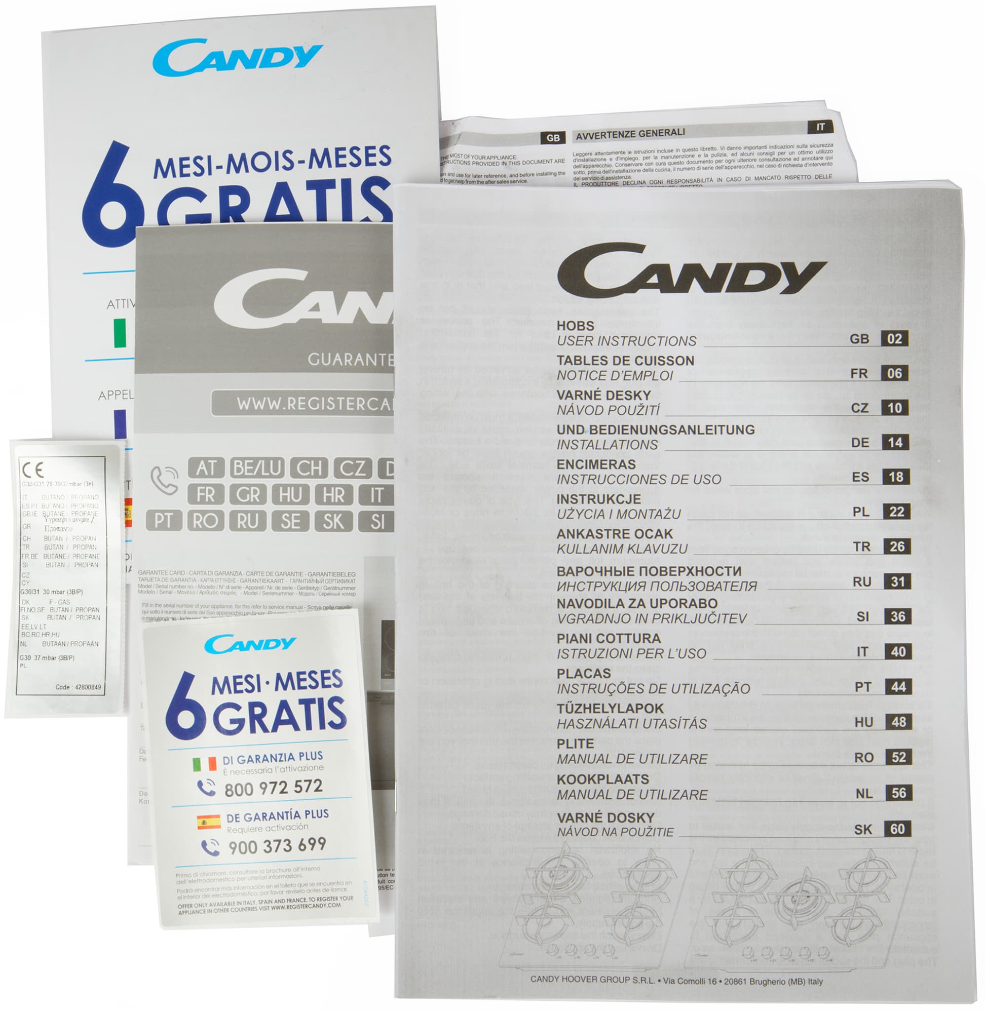 Для монтажа и подключения к газовой магистрали поверхности Candy CVG6DPB в комплекте дано все необходимое — монтажные скобы-фиксаторы, шурупы, 2 уплотнительные газовые прокладки, 2 угловых штуцера (под цилиндрическую и коническую резьбу). Между столешницей и панелью прокладывается уплотнительная лента, которая тоже входит в комплект.