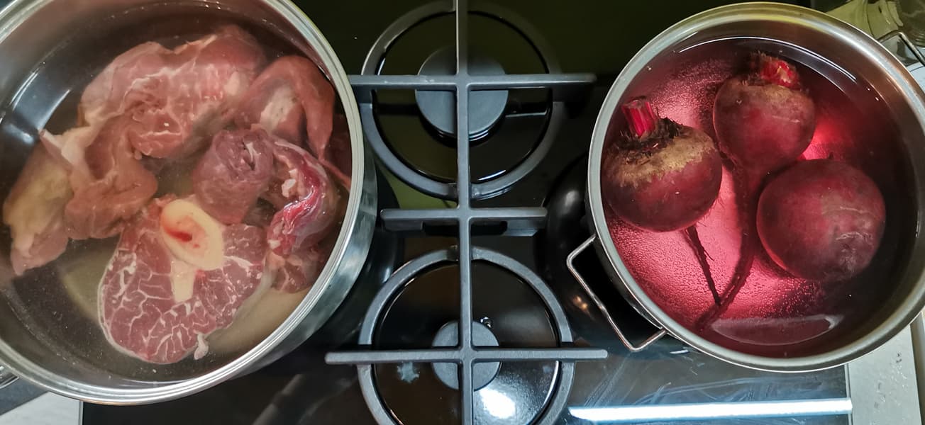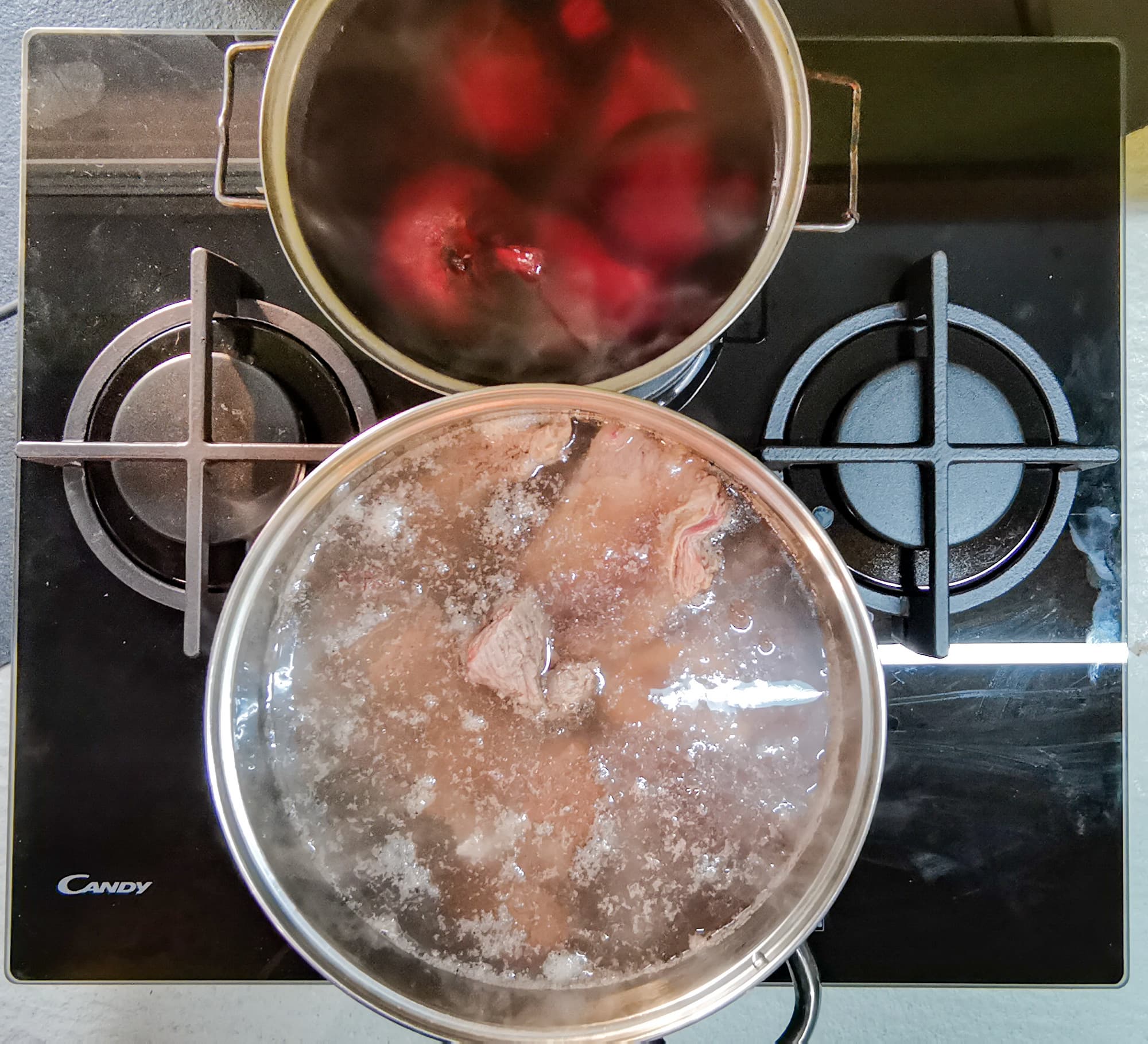 Мясо поставили вариться в 6-литровую кастрюлю сначала на средний, а после нагревания, на маленький огонь. Параллельно с мясом поставили вариться свеклу.