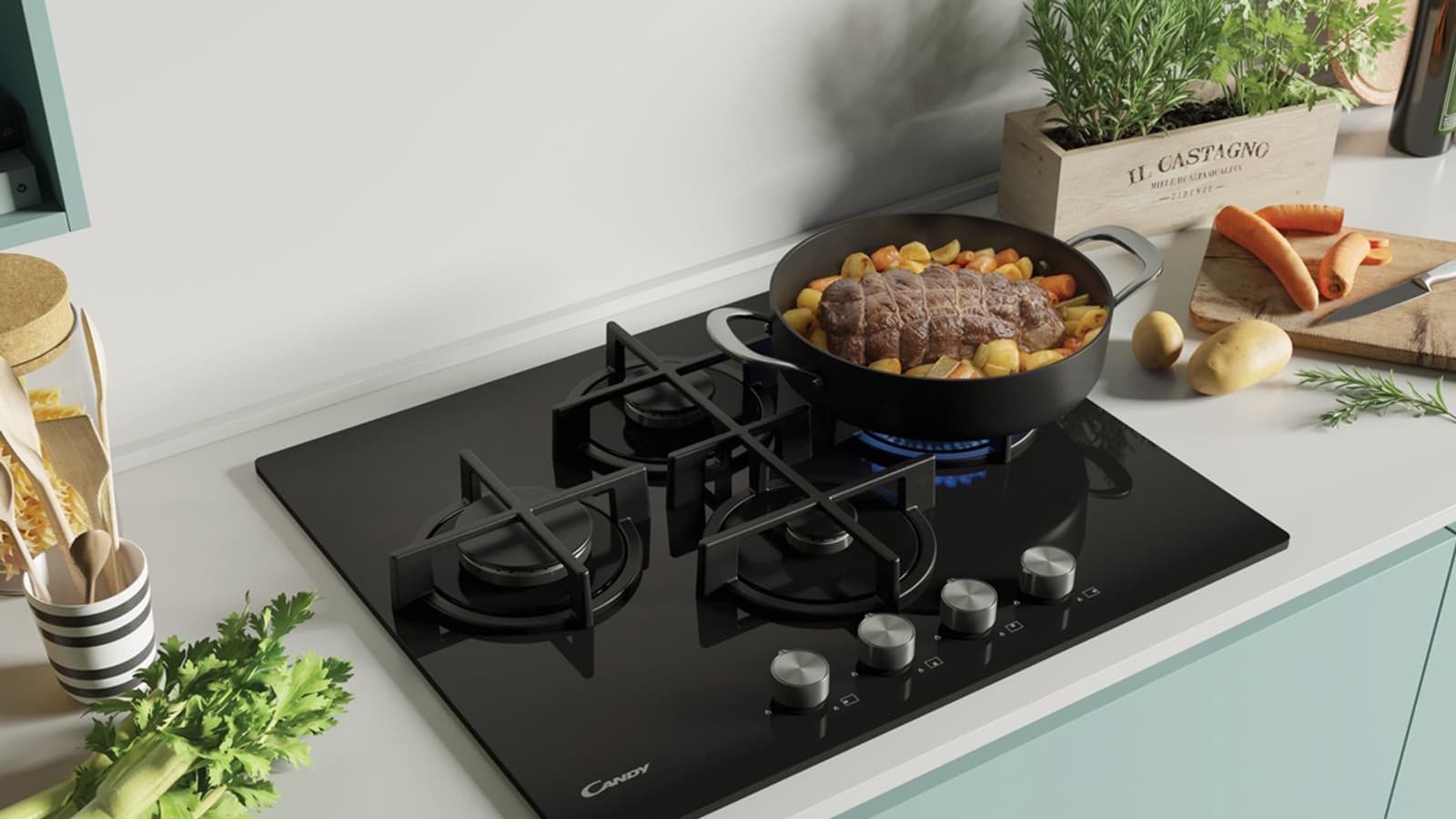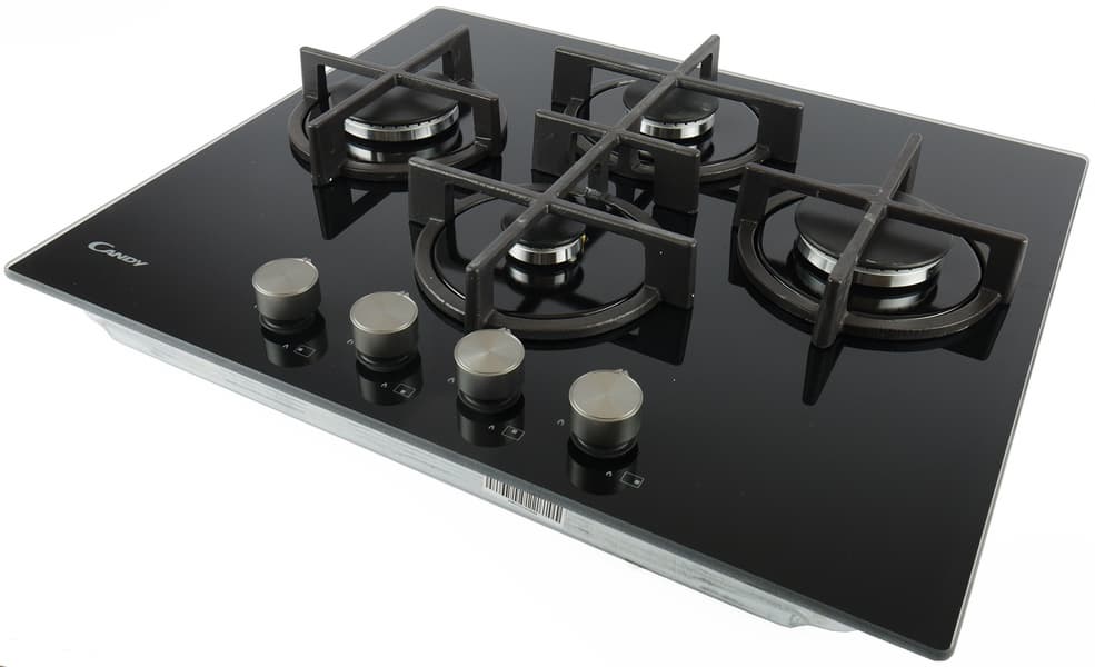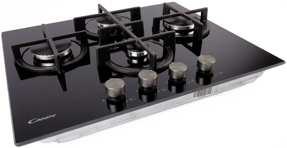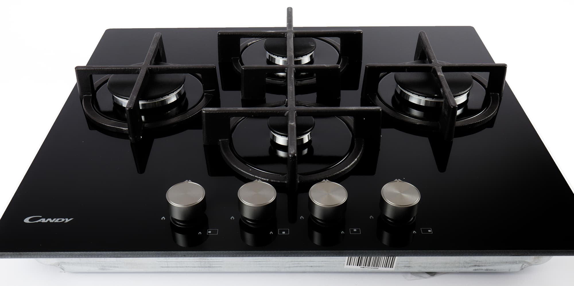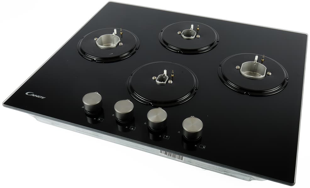Candy СVG6DPB — независимая варочная поверхность глубокого черного цвета со стильными маленькими чугунными решетками, она имеет поверхность из закаленного стекла, газ-контроль на все конфорки, электроподжиг, 2 конфорки повышенной мощности и возможность подключения к двум типам газа — магистральному и баллонному (сжиженному). Выглядит она достаточно стильно. Мы уже тестировали несколько моделей газовых варочных поверхностей этого производителя, будет интересно сравнить рабочие качества Candy СVG6DPB с ними.