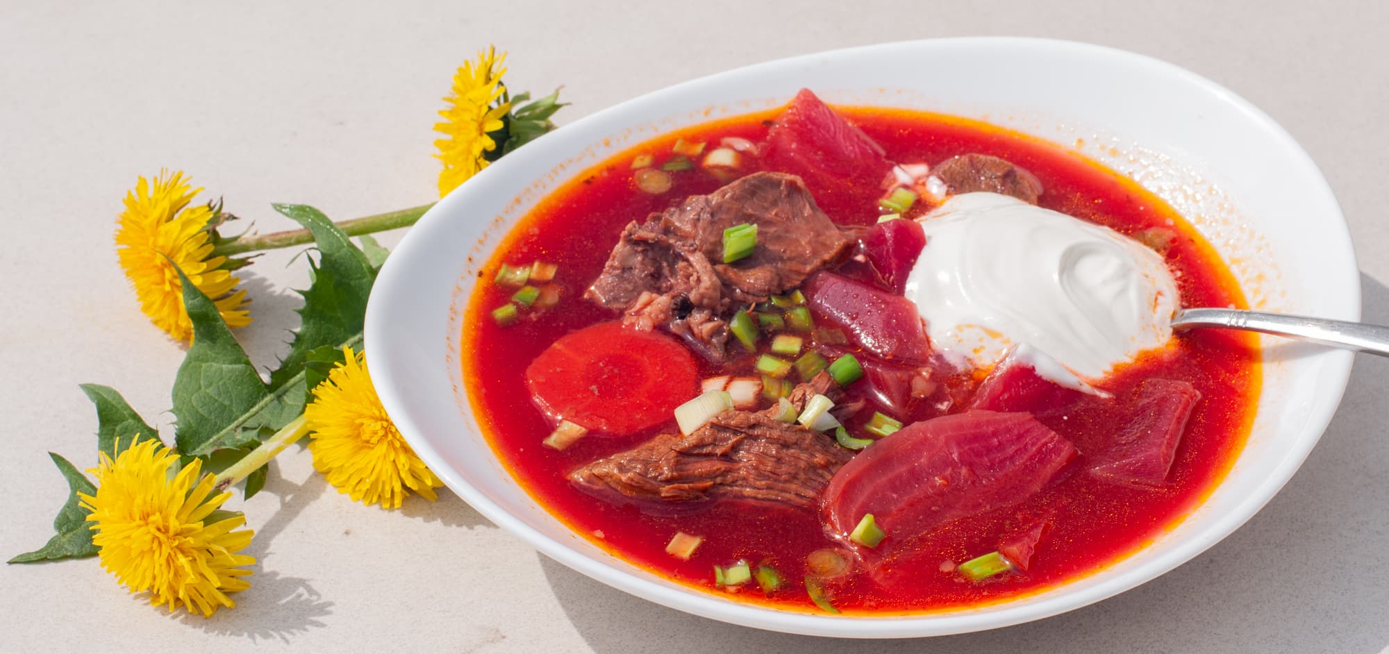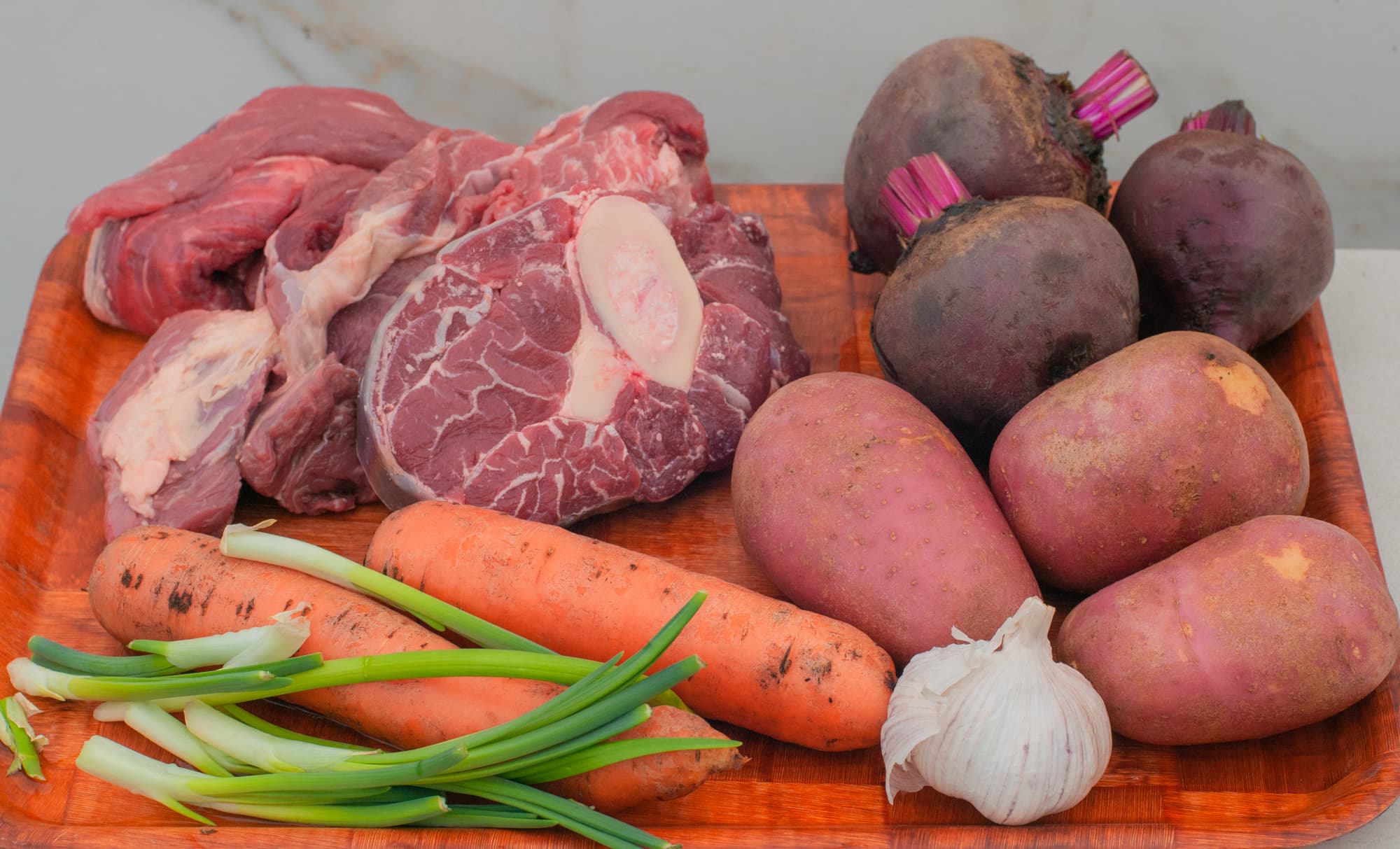 Для борща нам понадобилась говядина с косточкой, свекла, морковь, картошка, чеснок, томатная паста и зелень.