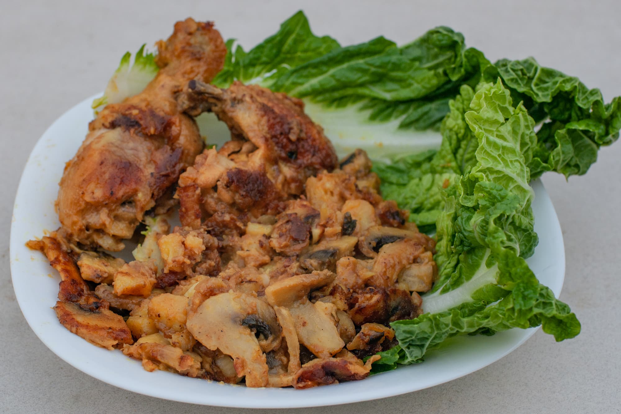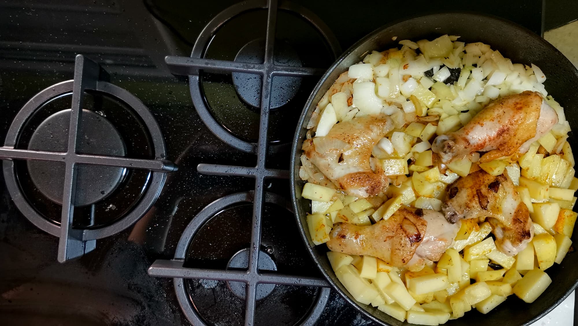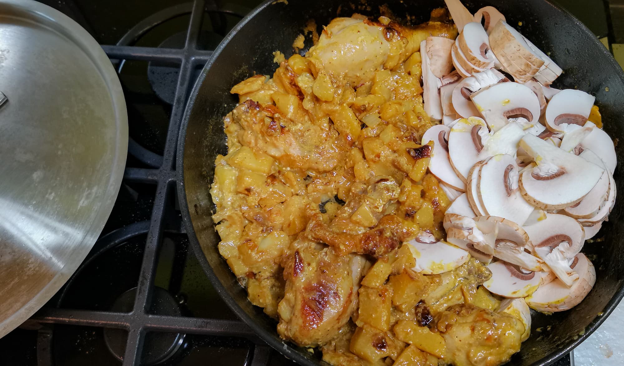Мы захотели быстро приготовить что-нибудь сытное, а в холодильнике нашлась курица, грибы, лук, картошка и сметана.