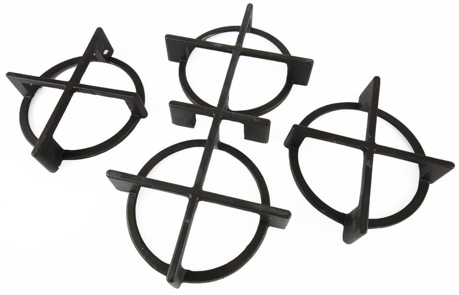 Решеток 3 штуки, две одинаковые одинарные и одна сдвоенная — на две центральные конфорки. Снизу чугунных решеток маленькие противоскользящие прокладки, которые защищают стеклянную поверхность от царапин. Решетки можно мыть в посудомоечной машине.